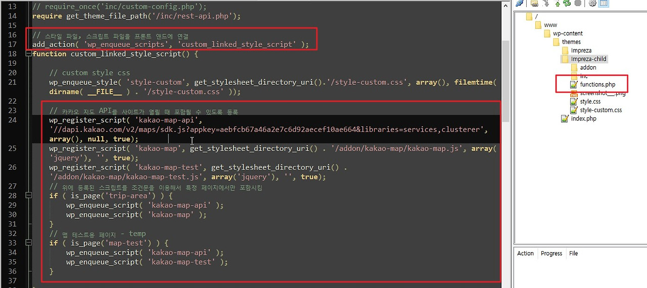 2. 푸터(footer) 쪽에 wp_enqueue_script로 api 연결 (클러스터러, 주소 변환 서비스도 연결 : &libraries=services,clusterer)
