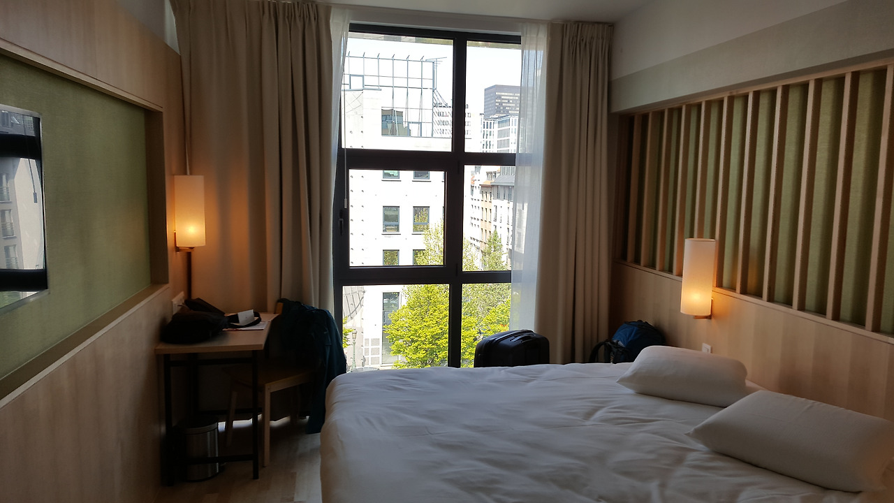 기차를 타고 가 브뤼셀 중앙역에서 전철로 갈아탄 우리는 숙소가 있는 지하철 역에 내렸다. 여행기간 내내 부지런히 모았던 예약 대행 사이트의 포인트로 결제한 호텔이었다. 리뷰가 별로 없어 살짝 불안했지만 숙소의 상태는 걱정이 무색할 정도로 훌륭했다. 아직 개업한 지 얼마 안 된 호텔이라 건물 내부 곳곳이 정비 중이었지만, 그것을 상쇄할 정도의 깔끔함과 친절함이 돋보이는 숙소였다. 객실 전망 역시, 비록 바다나 산 같은 자연 풍광은 아니었지만 고층 객실에서 내려다보는 시원한 시내 전망이 마음에 쏙 들었다.