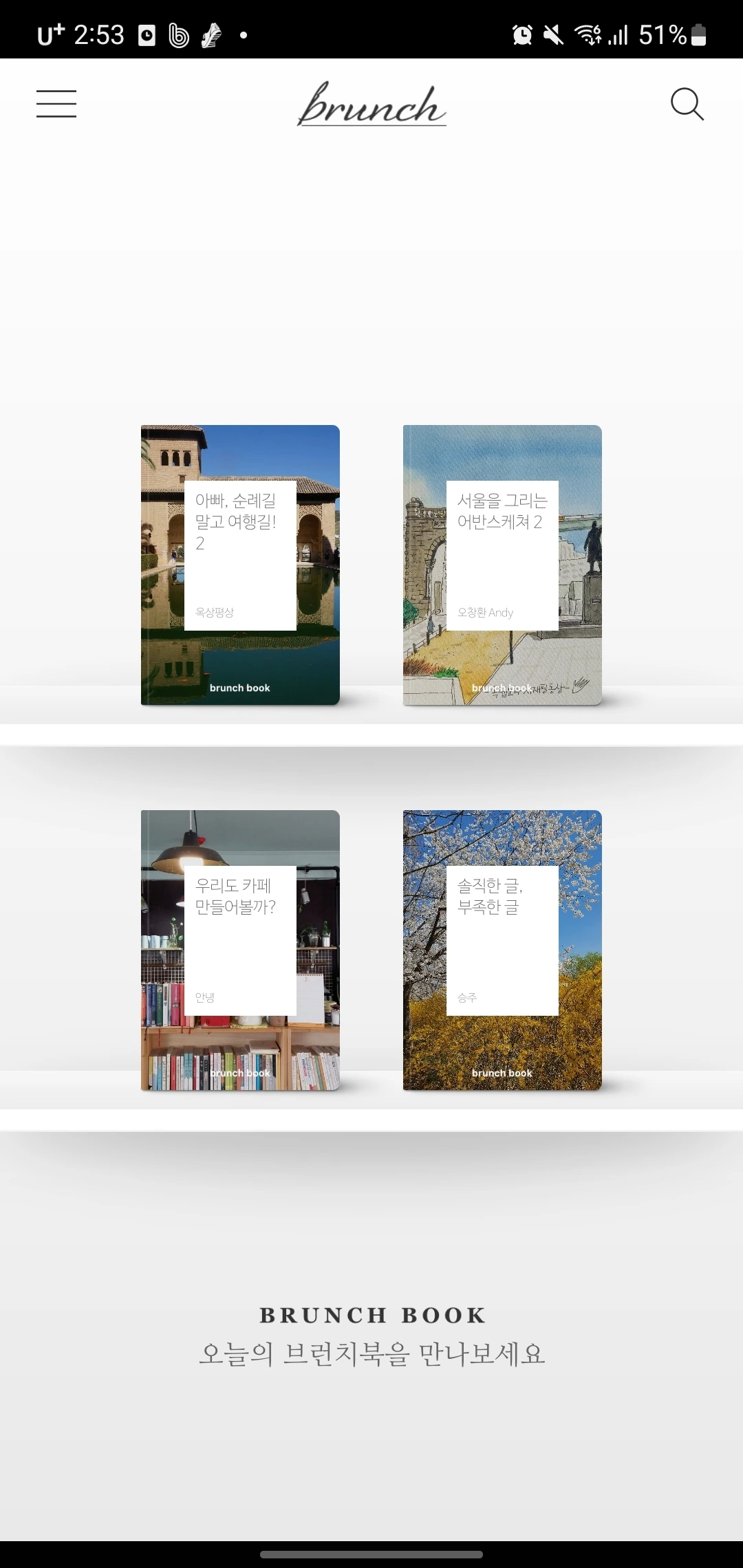 항상 브런치 메인에 올라온 여러 작가님의 글들을 읽으며 '이 세상에는 정말 글을 잘 쓰는 사람이 많구나.' 하며 감탄만 하고 지내던 나였는데, 그런 나의 글들이 오늘의 브런치 북에 선정되었다니 좀처럼 믿어지지가 않았다. 나의 미흡한 글에서 장점을 발견해 준 브런치팀에게 새삼 감사한 마음이 들었다.