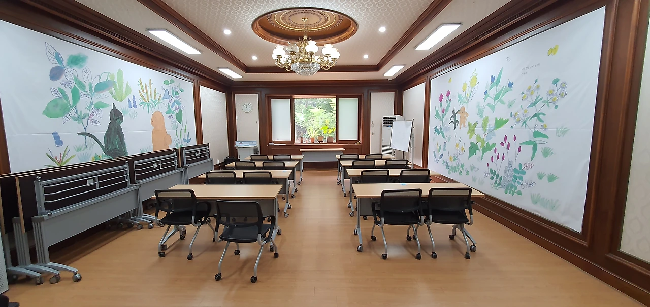 그 옛날, 권력자들이 술잔을 나누었던 연회장이 이제는 어린이들의 아기자기한 학습공간으로 바뀌어 있었다. 그야말로 권력무상임을 실감케 하는 장소였다. 벽면에 그려진 마주 보는 고양이와 개의 모습 또한 정겹기 짝이 없다.