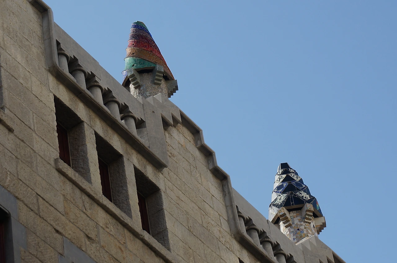 바르셀로나에 있는 대부분의 가우디 건축물들은 그라시아 거리와 람블라스 거리 일대에 늘어서 있다. 다시 찾아도 생기 가득한 람블라스 거리를 지나 며칠 전에 지나쳤던 구엘 궁전 앞에 섰다. 구엘 저택은 가우디의 작품 중에서도 가장 이질적인 느낌이었다. 가우디의 다른 작품들이 알록달록 밝은 원색의 느낌인데 반해 특히, 구엘 궁전은 어둡고 칙칙하며 무겁게 다가온다. 건물의 장식에 검정 색의 철을 많이 사용했기 때문이다. 원색의 굴뚝들만이 건물의 일부가 아닌 것처럼 지붕에 솟아있었다. 가우디는 까사 밀라의 투구 모양의 굴뚝에서 시도한 것과 같이 구엘 궁전에서도 굴뚝의 디자인으로 자신의 작품에 포인트를 주고 있었다. 기능과 디자인 모두를 살리려 했던 그의 노력이 빛나는 지점이라는 생각이 들었다.
