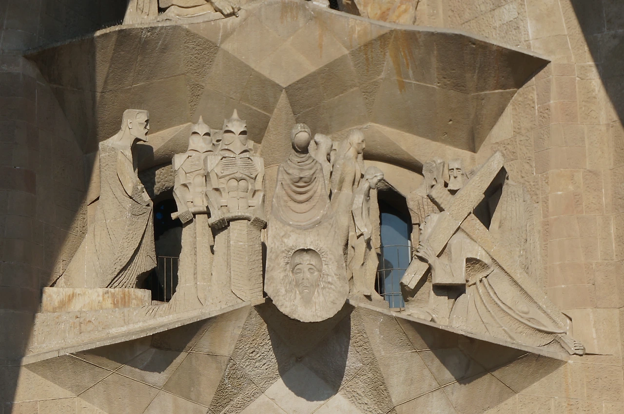 하지만, 그는 가우디에 대한 존경 또한 잊지 않았다. 피에 젖은 예수의 얼굴을 닦은 보자기를 펼친 베로니카 성녀를 가운데로 오른쪽에는 십자가를 짊어지고 가는 예수를, 왼쪽에는 그것을 걱정하며 바라보는 가우디를 조각해 넣은 것이다. 한 가지 재미있는 점은 가우디 옆의 로마 병사들이 쓰고 있는 투구의 모습이 까사밀라 옥상에 있는 굴뚝의 모양과 같다는 사실이다.
