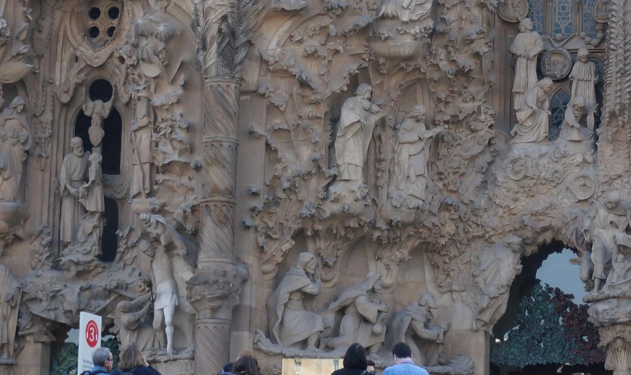 드디어 ‘사그라다 파밀리아’, 성가족 대성당에 도착했다. '사그라다'는 성스럽다는 의미이며, '파밀리아'는 가족을 뜻한다. ‘파사드’라고도 불리는 '탄생의 문', '수난의 문', '영광의 문'이 성당의 3면을 감싸고 있으며, 그것들은 각각 예수님의 12제자를 상징하는 4개의 탑을 갖고 있다. 그리고 이 12개의 탑은 예수를 상징하는 중앙 탑을 보호하듯 둘러싼다. 가우디가 완성한 탄생의 문은 과거를, 수비라치가 만든 수난의 문은 미래를, 현재 공사 중인 영광의 문은 현재와 부활을 상징한다. 또한, 각각의 파사드의 가운데에 위치한 문은 ‘사랑’을 의미하며 양 옆의 문은 ‘믿음’과 ‘소망’을 뜻한다.