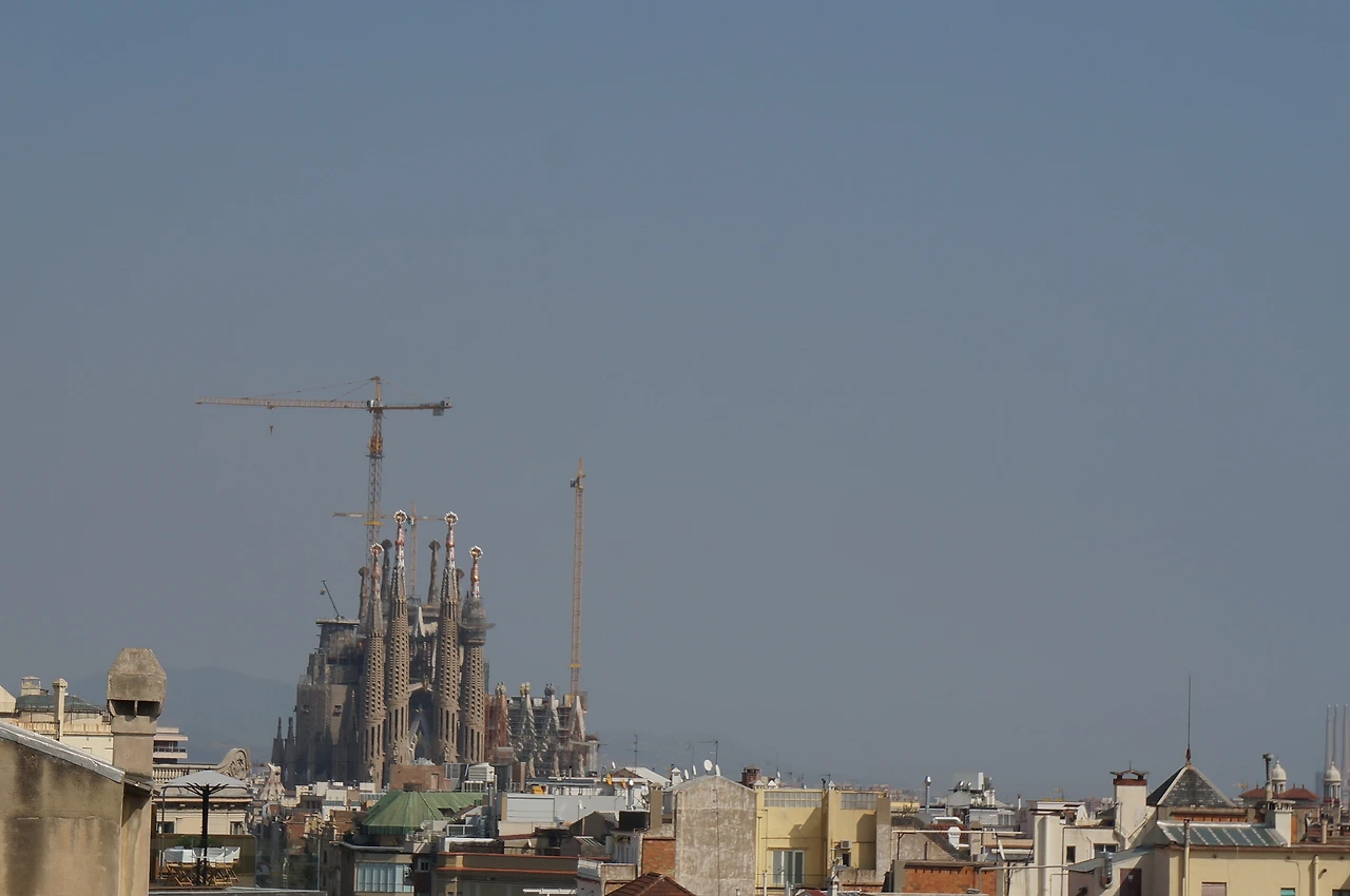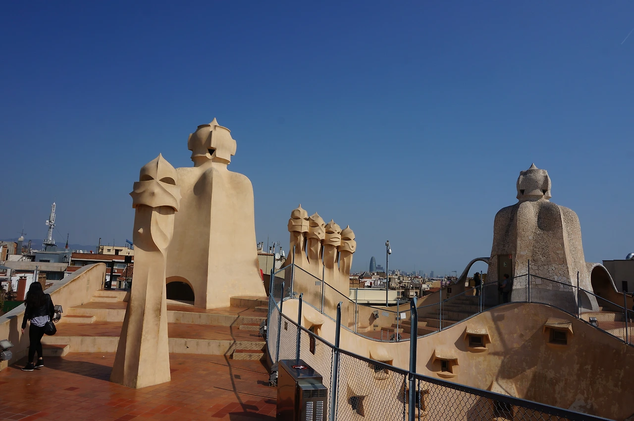 건물 옥상이라고 하기에는 너무도 특이한 외계 행성의 사막 같은 장면이 눈앞에 펼쳐졌다. 모든 것이 둥글둥글한 곡선으로 가득한 옥상에서 중세 투구 모양의 굴뚝들은 마르기 전 누군가 살짝 꼭지를 잡아당긴 것 마냥 뾰족뾰족한 느낌으로 하늘을 찌르고 있었다. 스타워즈 시리즈의 악당 다스베이더 가면의 원형이 되었다는 그 굴뚝이었다. 어제 보았던 성가족 대성당의 '수난의 문'에서는 로마 병사의 투구의 형태로도 등장했다. 굴뚝의 뾰족한 정수리가 자칫 단조로워 보일 수도 있는 두리뭉실한 옥상에 포인트를 주고 있었다.