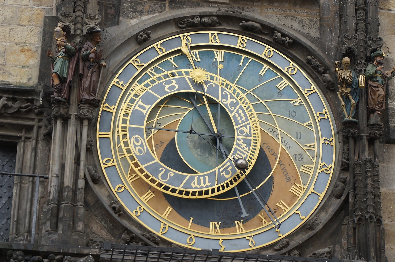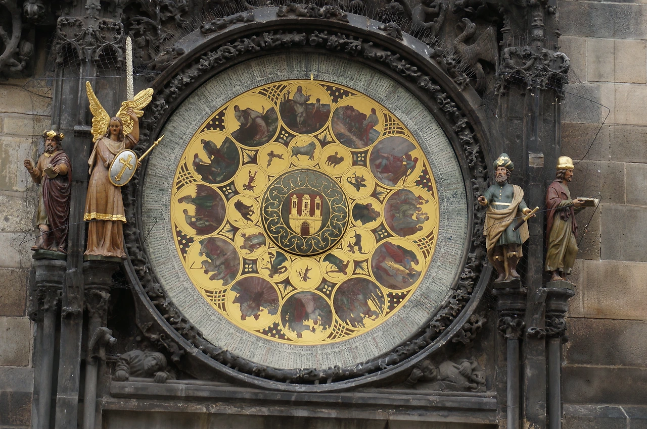 사람들이 천문시계를 향해 모여있었다. 매시 시작되는 천문시계의 퍼포먼스를 보기 위함이었다. 천문시계는 크게 두 부분으로 나뉜다. 천동설을 기반으로 한 해와 달의 움직임을 계산한 칼렌다륨이 위에 있고 황도 12궁의 별자리와 그 시기해야 할 농사일을 알려주는 플라네타륨이 그 아래에 있다. 매 시간 정시가 되면 칼렌다륨의 왼쪽에 달려있는 해골 인형이 종을 치면서 죽음의 때가 왔음을 알리면 바로 옆에 있는 쾌락을 상징하는 악기를 든 투르크인과 오른쪽에 있는 허영을 상징하는 거울을 들고 있는 귀족 인형과 탐욕을 상징하는 황금 주머니를 들고 있는 유대인 인형이 일제히 고개를 저으며 죽음을 거부한다. 이어, 위쪽 가운데에 위치한 두 개의 창으로 12명의 사도가 차례로 모습을 드러내고 마침내 황금색 닭이 정시가 되었음을 알린다. 그 어떤 세속의 화려한 것들도 닥쳐올 죽음의 시간만은 거부할 수 없다는 강렬한 메시지를 천문시계는 매 시간 보여주고 있었다.
