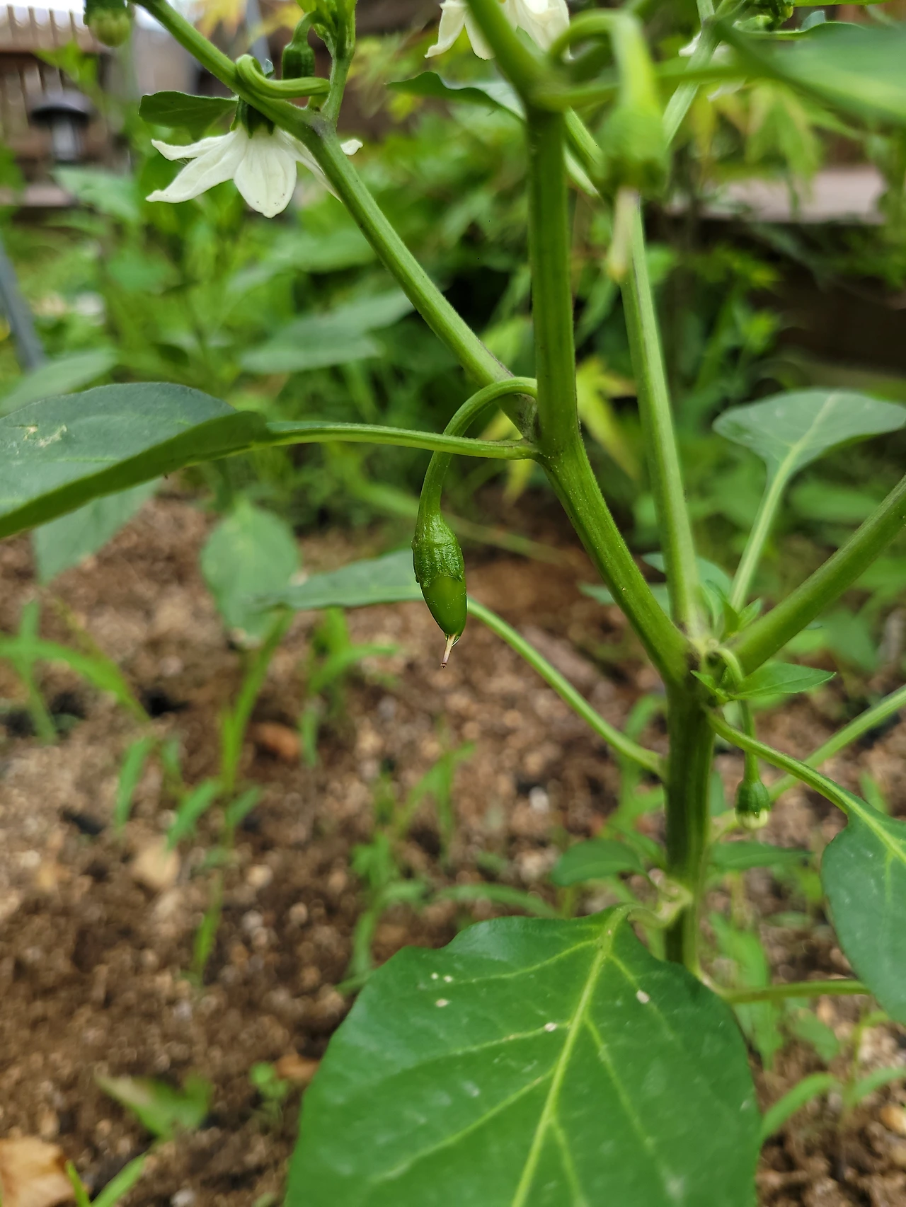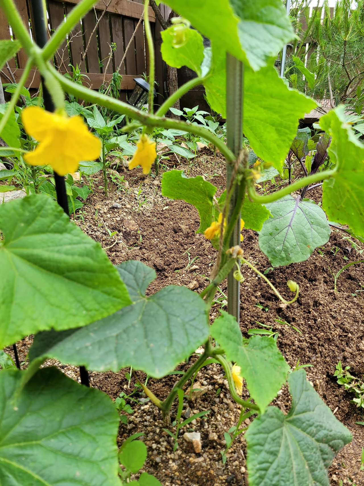 지난번 바람에 다행스럽게도 고추나 토마토가 하나도 쓰러지지 않고 뿌리를 잘 내려주었다. 이웃들은 특히 고추가 냉해를 입어 몇 번을 다시 심었다고 했는데, 우리 채마밭의 고추는 싱싱하게 뿌리를 내렸고, 꽃도 피더니 조그만 고추가 달렸다. 매운 고추 두 개와 아삭이고추, 피망도 섞어 심었고 가지와 오이도 심었다. 오이도 조그맣게 달려있고, 꽃을 피우고 있다. 가지는 안토시아닌이 풍부한 건강야채다. 달리기 시작하면 주렁주렁 달리니, 올해는 구워서라도 많이 먹을 작정을 하고 심었다.