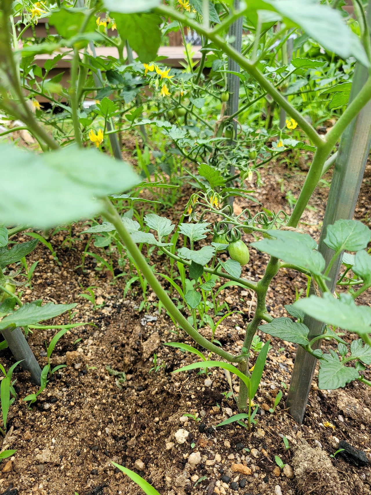 풀들이 있건 말건 얘들은 자기네 몫은 한다. 꽃을 피우고 열매를 맺고 완숙되기 위해 자라기 시작한다. 나머지는 내 몫이다. 얼마나 잘 가꿔 주느냐에 따라, 맺힌 열매가 튼실해지던지 제대로 못 크고 말던지 할 것이다. 풀도 뽑아줘야 하고, 지줏대도 든든하게 세우고, 잘 묶어주어 힘들지 않게 해줘야 하며, 물도 잘 조절해서 줘야 한다. 마트에서 사 먹을 때는 야채들이 이런 공으로 시장에 나온 것인 줄 몰랐다. 하기야 세상 무엇이 거저 생겨난 것이 있으랴 땀과 눈물이 없이 형성된 것은 아무것도 없다. 머릿속의 아무것을 제외하고는...