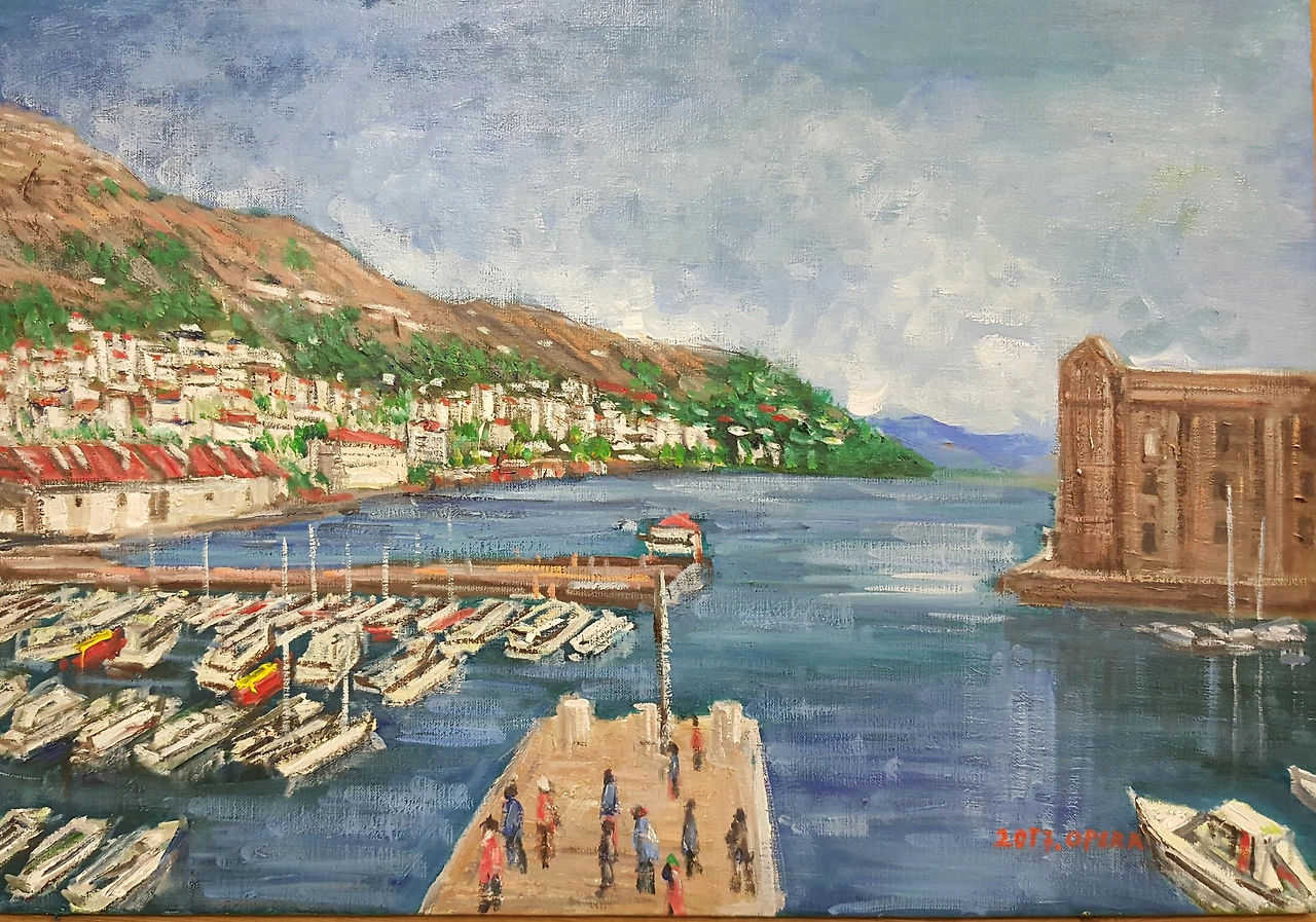 유람선을 기다리는 선착장과 추억하며 그린 유화