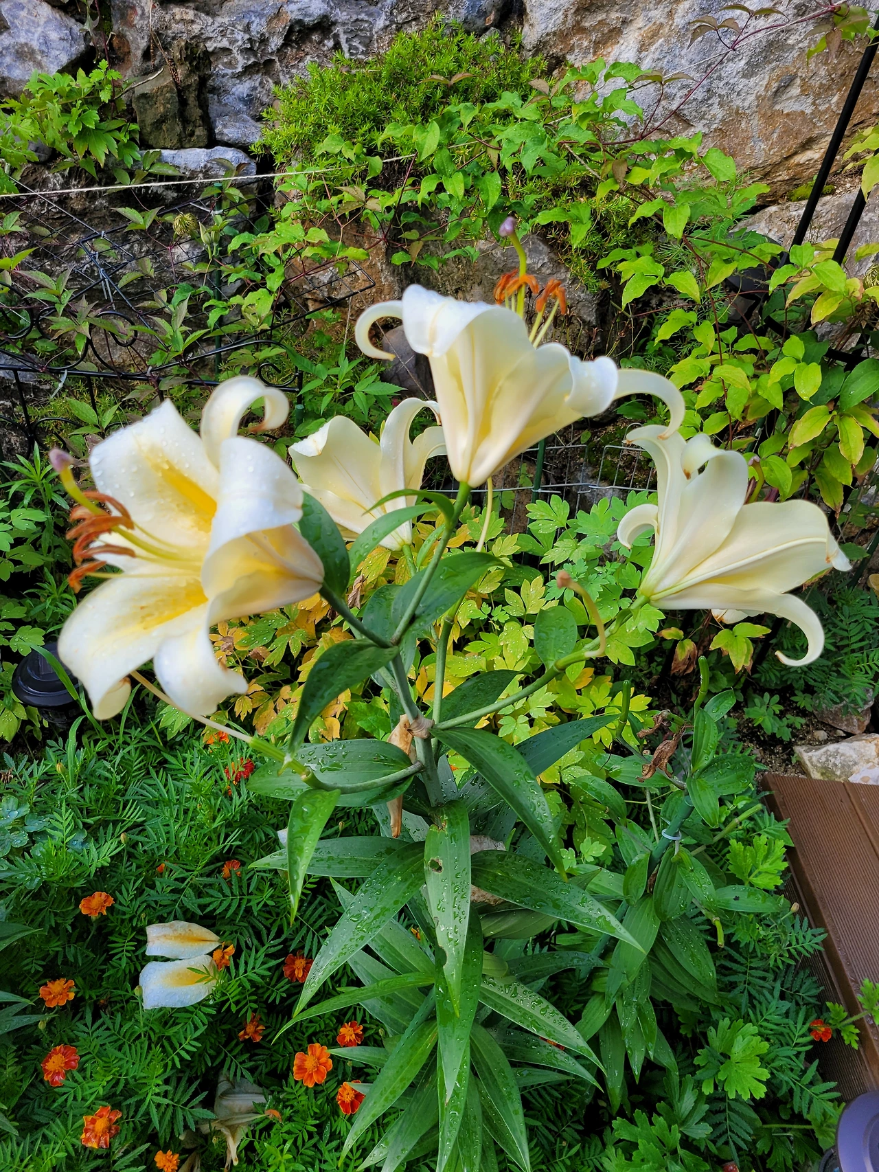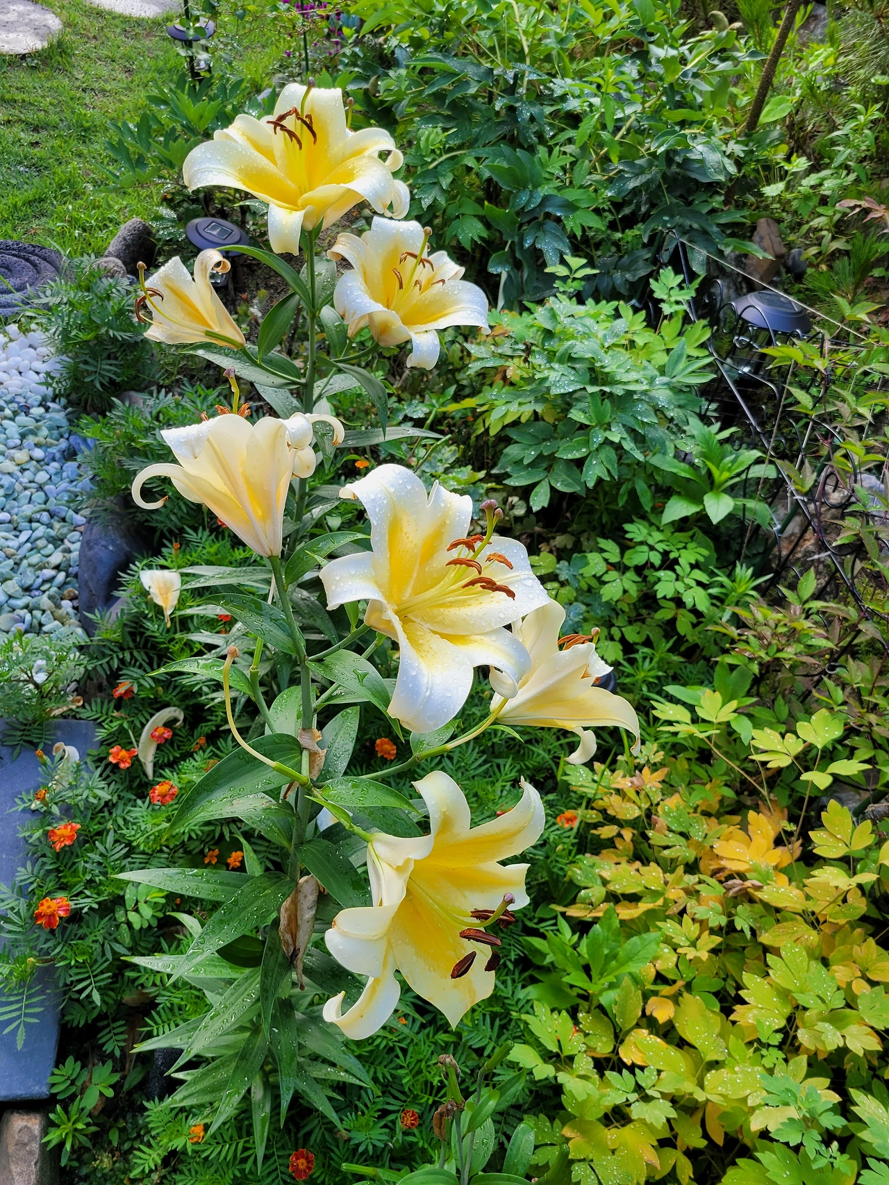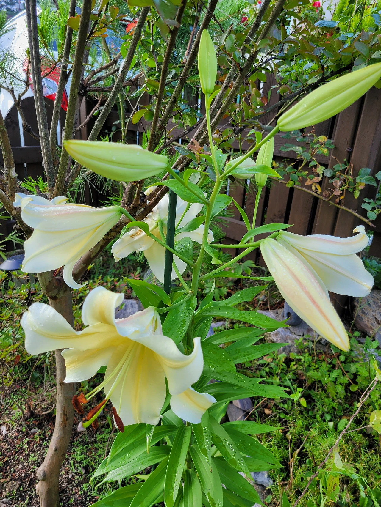 혹시 구근이 제대로 자라지 않아 꽃도 못 피고 사그라들까 봐... 실제로 그런 때도 많았다. 그런데 모든 예상을 뒤엎고 백합이란 백합은 다 잘 자라서 꽃을 활짝 피웠다. 앞마당의 백합은 첫 봉우리 활짝 핀지가 2주가 넘었는데도 싱싱하고 옆에 아이가 덩달아 피어 깔끔하게 만개한지도 일주일은 된듯하다. 긴 지줏대가 부족하진 않은지 돌아본다. 꽃송이에 물방울이 맺혀있다. 간밤에도 비가 내렸나 보다. 얼마나 세게 퍼부었는지도 알 수없지만, 어쩌면 모두 잠든 새에 비는 제 할 일을 하고 아침에 급히 떠났는지도 모른다.