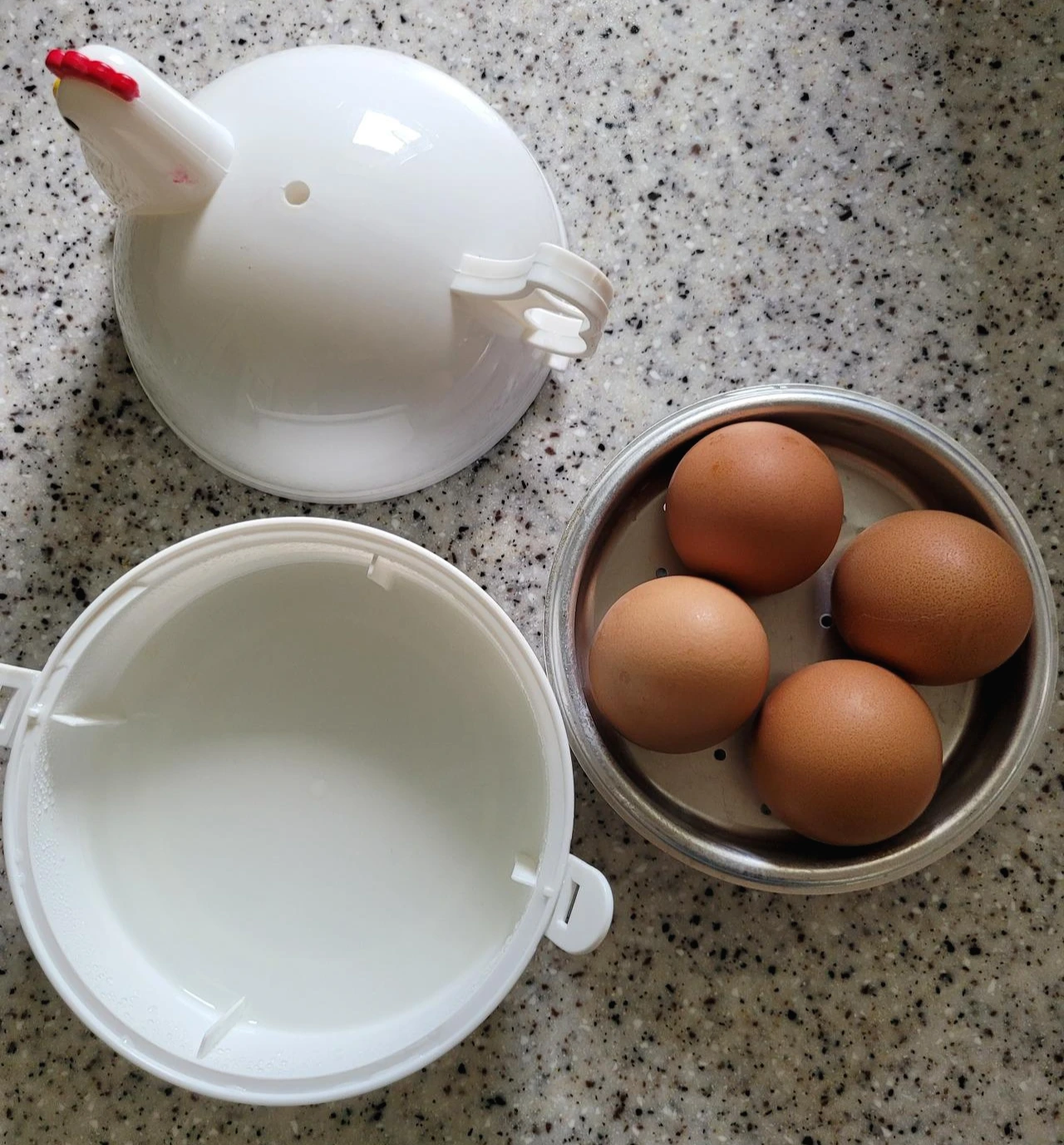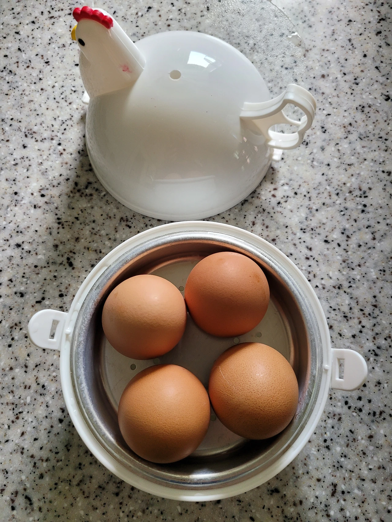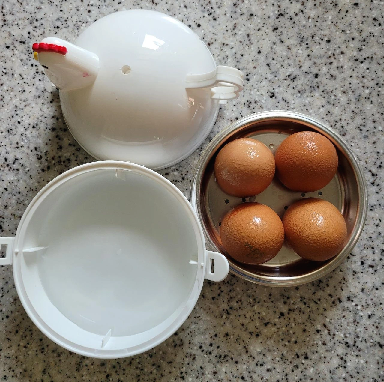 달걀 네 알을 넣고 7분간 돌렸다. 친구가 10분 정도 돌리면 완숙이 된다고 해 약간 반숙기가 있도록 8분을 돌렸다. 7분이 지나 꺼내서 찬물에 식혀 "탁" 두드려 껍질을 깨려고 보니, 거의 익지 않았다. 달걀을 식힌 후에 냉장고에 넣고 나중에 스크램블 에그를 만들어 먹었다.
