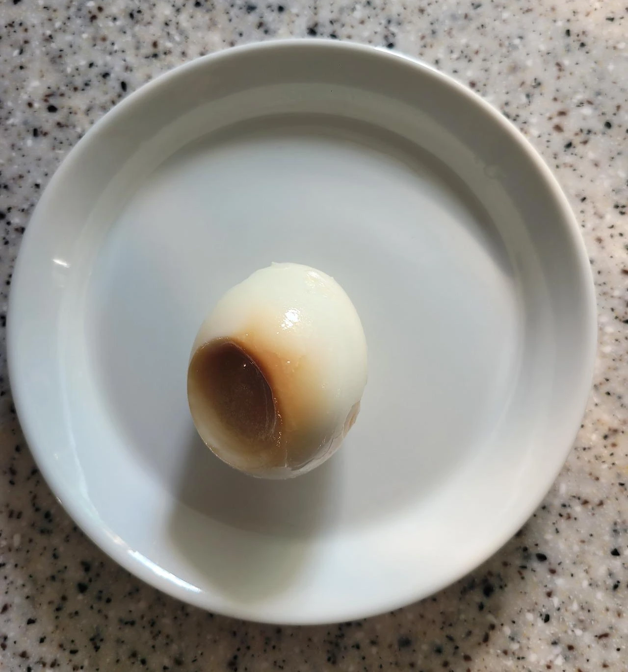 친구에게 물었더니 "왜 그럴까 그럼 다음엔 10분 이상 돌려봐" 나는 우리 달걀 찜기가 이상 있나 싶어, 쓰고 싶진 않았지만, 다음날 다시 한번 도전하기로 했다. 이번엔 10분을 충분히 돌렸다. 용기까지 뜨거워진 찜기를 잘 꺼내보니 달걀 하나가 껍질이 갈라지고, 약간 탄 것처럼 보였다. 찬물에 식힌 후 껍질을 깠다. 잘 까지지도 않았는데, 역시나 윗부분이 약간 덜 익었다. " 아~ 또 안된 건가?" 속상한 마음이 들었는데, 덜 익은 부분을 흘러내려버리고 반이상은 익었기에 껍질을 까고 한입 살짝 베었다.