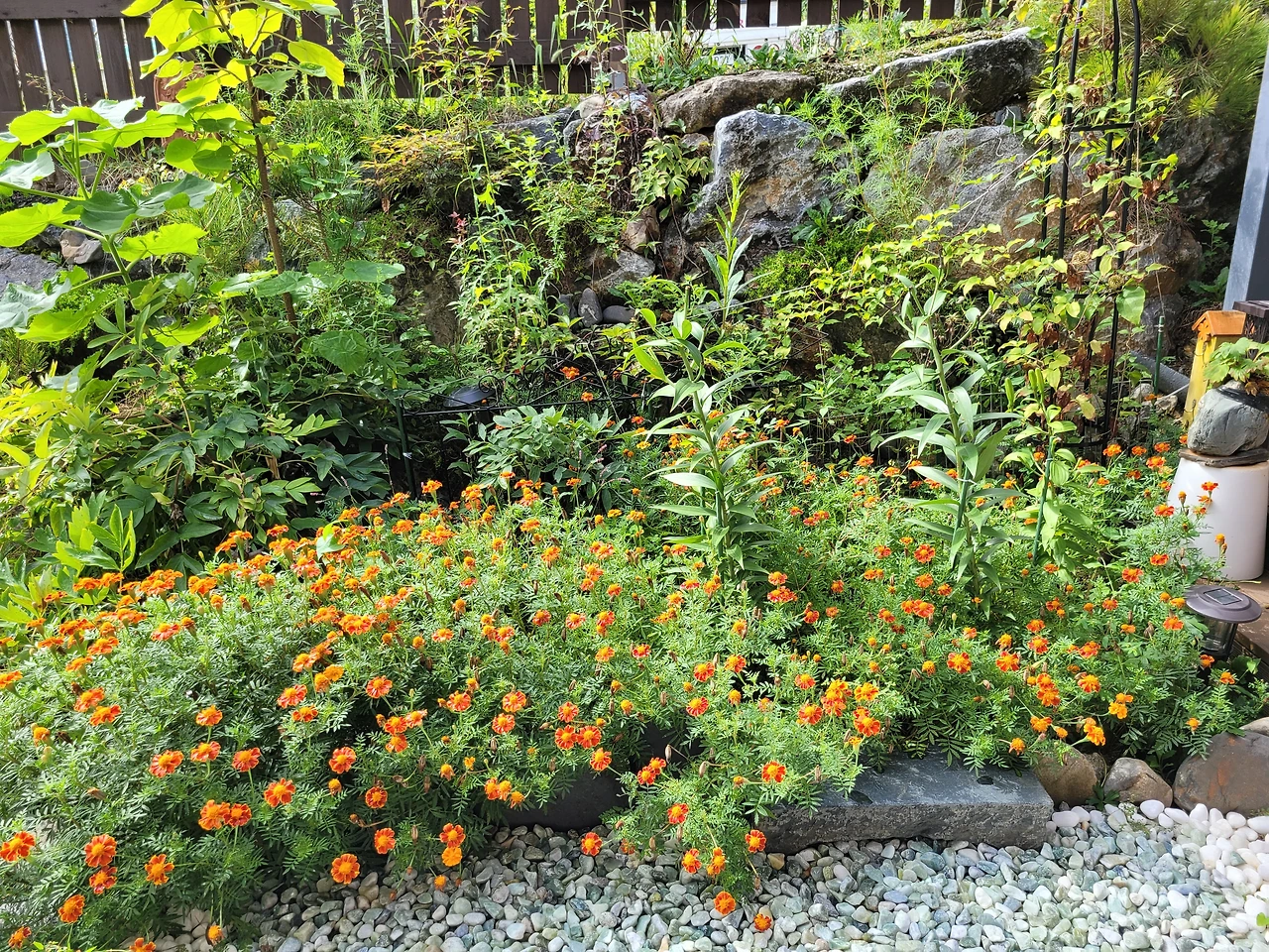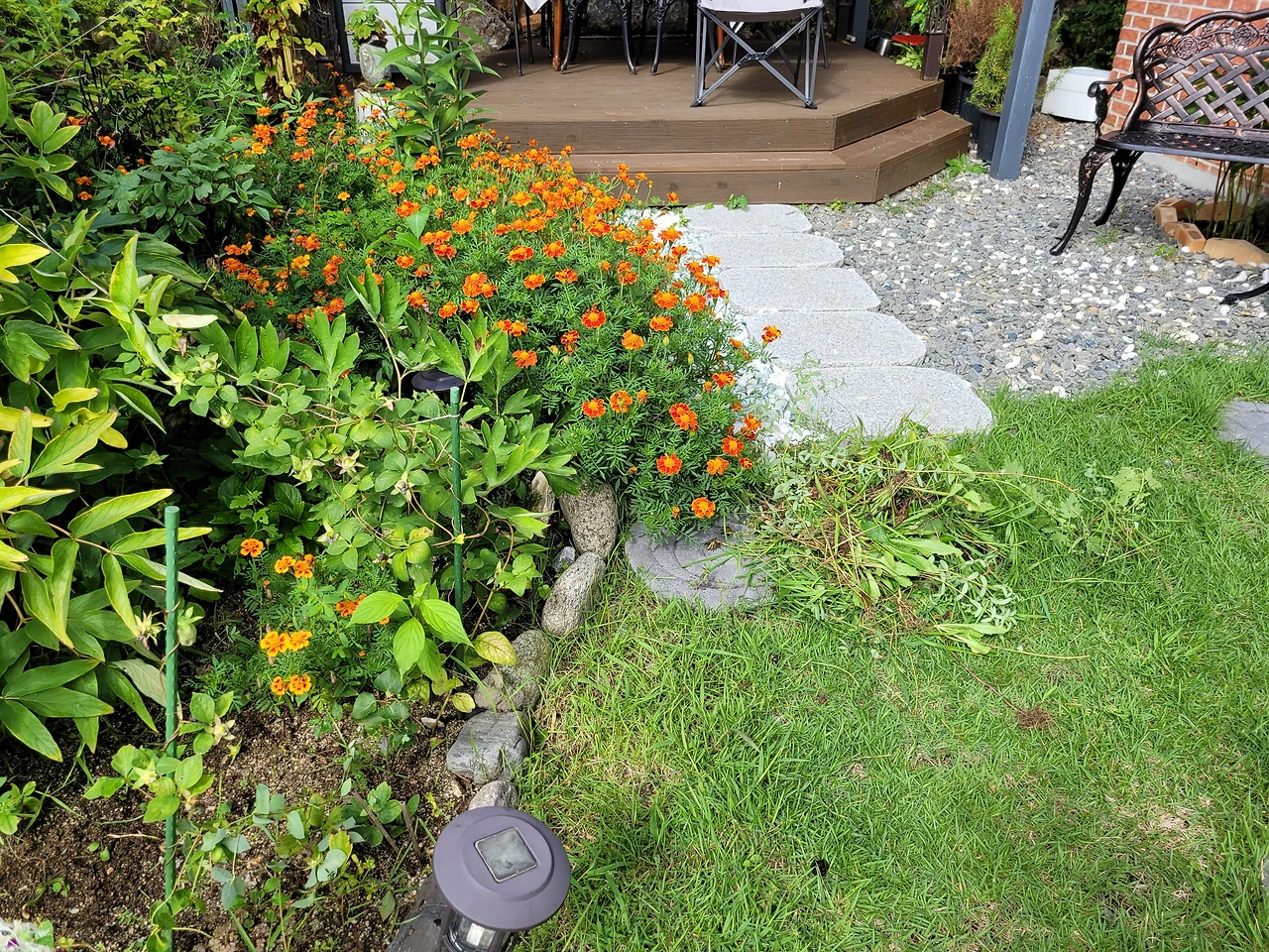 마침 어제 비가 많이 왔기에 아직도 땅이 촉촉해 풀도 잘 뽑힐 것 같았다. 작정하고 연장을 들고 마당에 나간다. 작은 마당밭도 신기하게 일하려 하면 작은 땅이 아니다. 앞마당 쪽 작은 정원에는 한쪽으로 메리골드가 지천이다. 우리 마당은 주인을 잘못 만나 돈 주고 사서 심은 꽃보다는 야생화들이 잘 사는 편이다. 봄이면 마가렛꽃이 지천이고 마가렛이 진 늦여름부터는 메리골드가 온 마당을 덮는다. 메리골드 향을 좋아하기도 하고, 잘 피고 일단 피면 질 때까지 튼튼하게 잘 자라기도 해 그냥 두는 편이다. 한두 해 보내다 보니, 자라도 너무 잘 자라고 뽑아내도 상관없이 다음해면 또 나온다. 올해도 어김없이 배롱나무의 붉은 꽃과 더불어 노란 메리골드는 마당을 환하게 해주고 있다. 너무 많아 다들 뽑으라고 난리다. 그래 이제는 정리를 해줘야겠다.