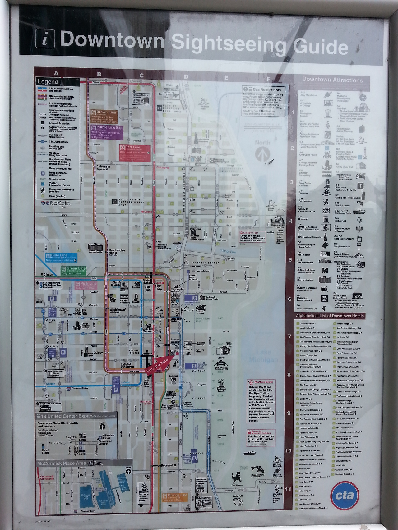 오전 9시 25분 시카고 오헤어 공항에 무사히 도착했다. 약간 흐린 날씨다. 몇 번 온 것 같지 않게 낯설고 새롭다. 이래서 여행은 인생 이방인을 만드나 보다. 입국심사 후 5번 터미널에서 2층으로 올라가 3번 터미널 가는 공항 기차 타고 3번 터미널 지하에서 시내 가는 전동차 CTA blue line 탄다. 시카고 지하철(CTA)은 시카고 블루라인은 오헤어 공항에서 시내, 루프 지역을 지나 포리스트 파크에 이르는 총 43km의 길이고 33개의 역을 지난다. 시카고의 정 중심지 루프 지역의 잭슨 역 다음의 라셀라(Rasella) 역이 내가 내릴 곳이다. 2008년도에는 계속 걸어 다녔지만 이번엔 외곽지역을 갈 예정이라 벤트라 카드(교통카드) 7일권을 33달러에 구매했다. 그런데 핸드폰 시간은 아직도 안 바뀌고 있다. 새벽 한 시 10분이다. 맘에 들지 않는 통신사다.