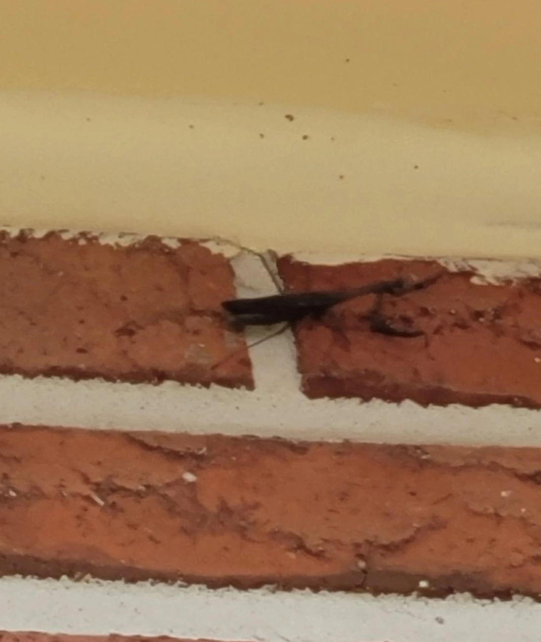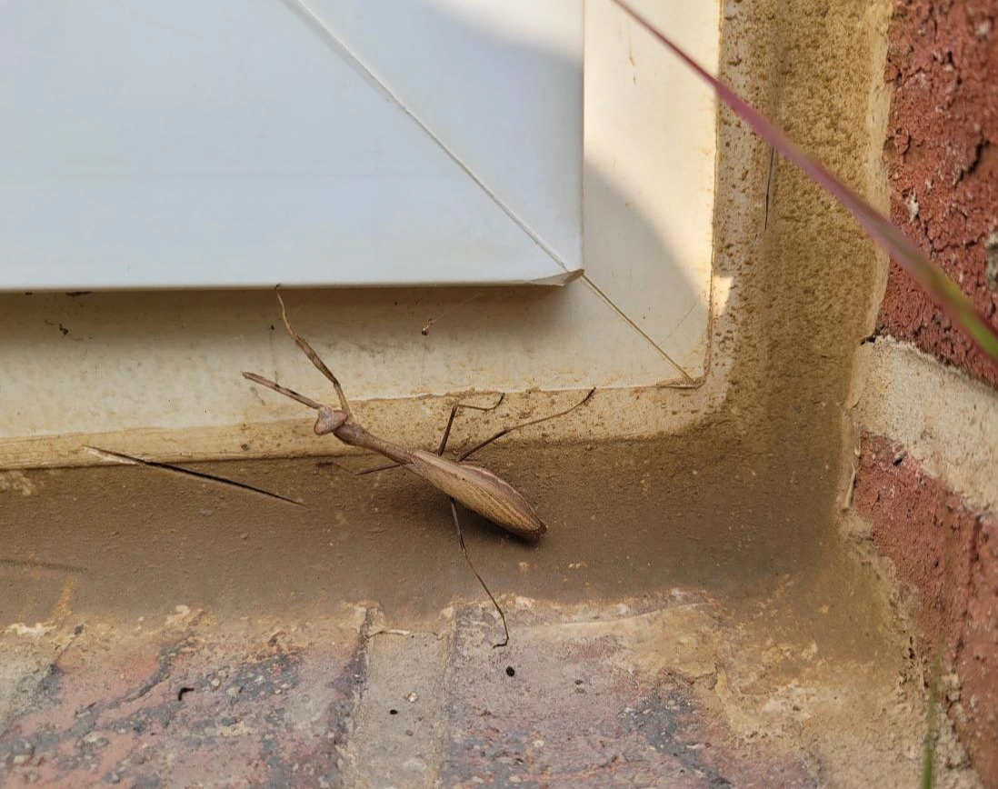 벽으로 기어올라가는 사마귀 아직은 초록의 몸이다. 처마 끝에 매달린 사마귀