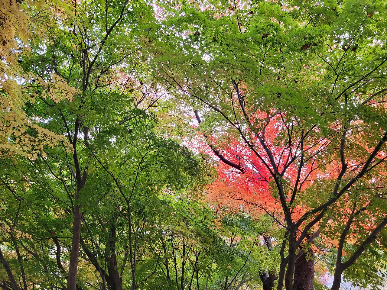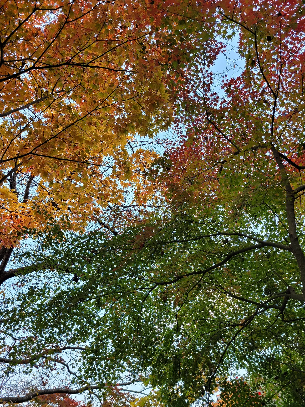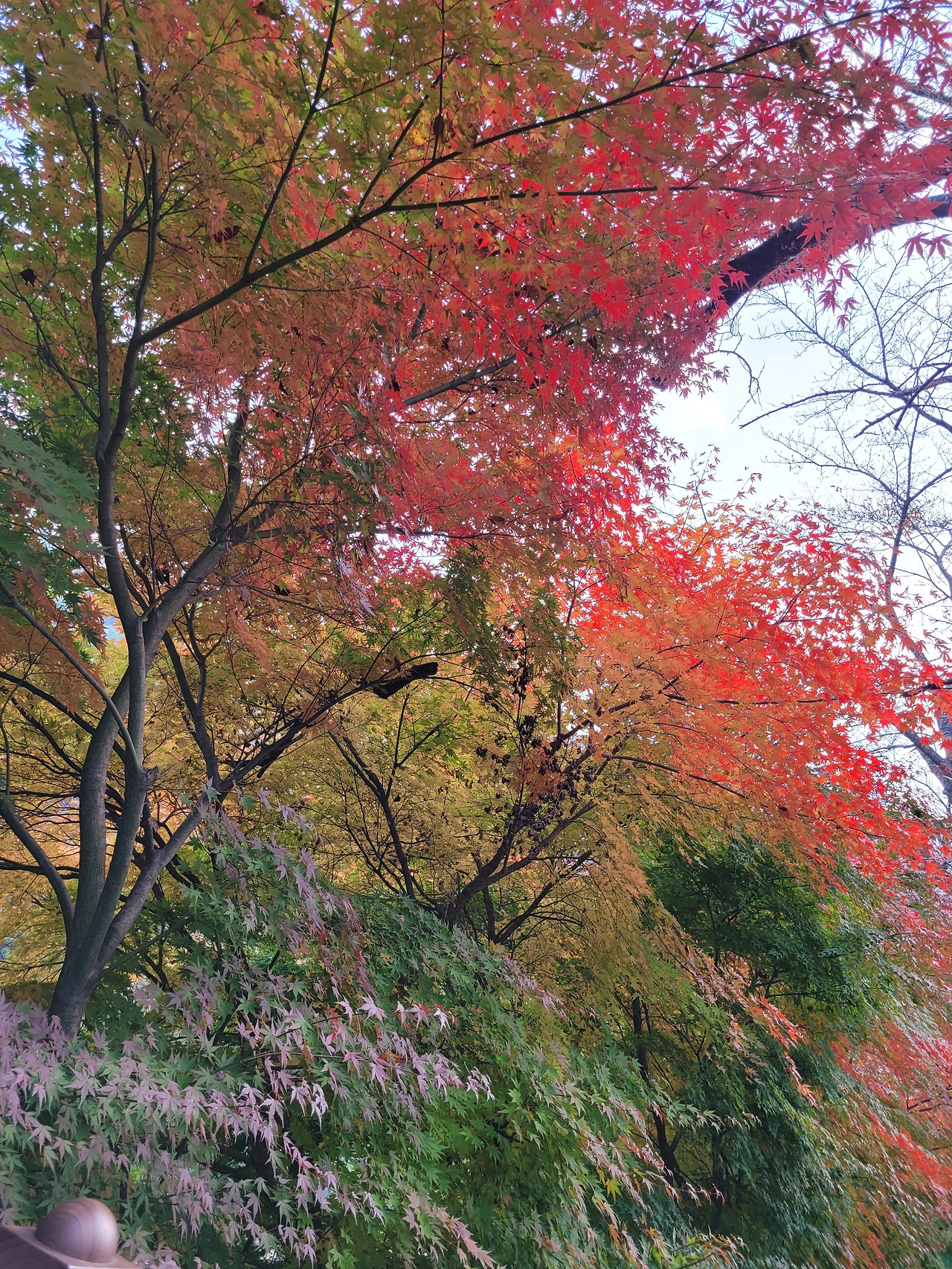정말 빨갛고 예쁘게 물든 단풍도 있지만 아직까지 푸르른 단풍도 많다. 이 아이들이 청단풍이라 그런 것은 아니다. 홍단풍이지만, 아직 물이 덜 들었을 수도 있고 물들어 가는 중일 수도 있다. 아니면 제대로 색도 못 내보고 말라서 떨어질 수도 있다. 빨간색, 주황색, 초록색, 연두색, 약간 밤색, 갈색, 조금 덜 빨간색... 색을 단색으로 표현할 순 있지만, 그 색으로 가는 과정 중의 색은 뭐라 표현할 수 없다. 먼셀 표색계로 자주에서 녹색까지 13가지다. 각색마다 채도에 따라 몇 가지씩 나눠지는 것을 감안해서 명명할 수 있는 색 만으로도 족히 수십 가지는 넘을 것이다. 물론 나의 의미로는 이 자연의 색은 셀 수도 없다.