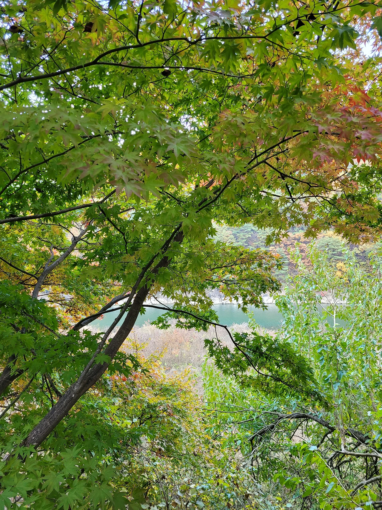 이 나무들이 하나도 빠짐없이 새빨간 잎으로 하늘로 땅으로 가득 차 있다면 어땠을까... 온 세상의 붉은빛이 봄의 벚꽃처럼 아름다울 수도 있을진 모르지만, 붉은 잎만 달려있다면 핏빛의 단풍들만 널려져 있다면 한편으론 섬뜩하진 않았을까 하는 우스운 생각도 해본다. 모르긴 해도 다른 색들이 섞여 있기에 붉은색이 더 돋보일 수 있었을진 않았을까. 굵고 오래된 단풍나무를 보면 아직 초록 잎도 있고 노란 잎도 있고 누런 잎도 있고 주홍 잎도 있다. 거기에 말라 버린 단풍잎도 많다. 빨갛지 않은 단풍잎들이 많기에 빨간 단풍잎이 더 아름답고 붉어 보이는 것이다. 모든 색이 섞여 있기 때문에 대비가 되어 훨씬 더 아름다운 것이다. 빨갛게 물들지 못한 단풍잎이 새삼스레 고마웠다.