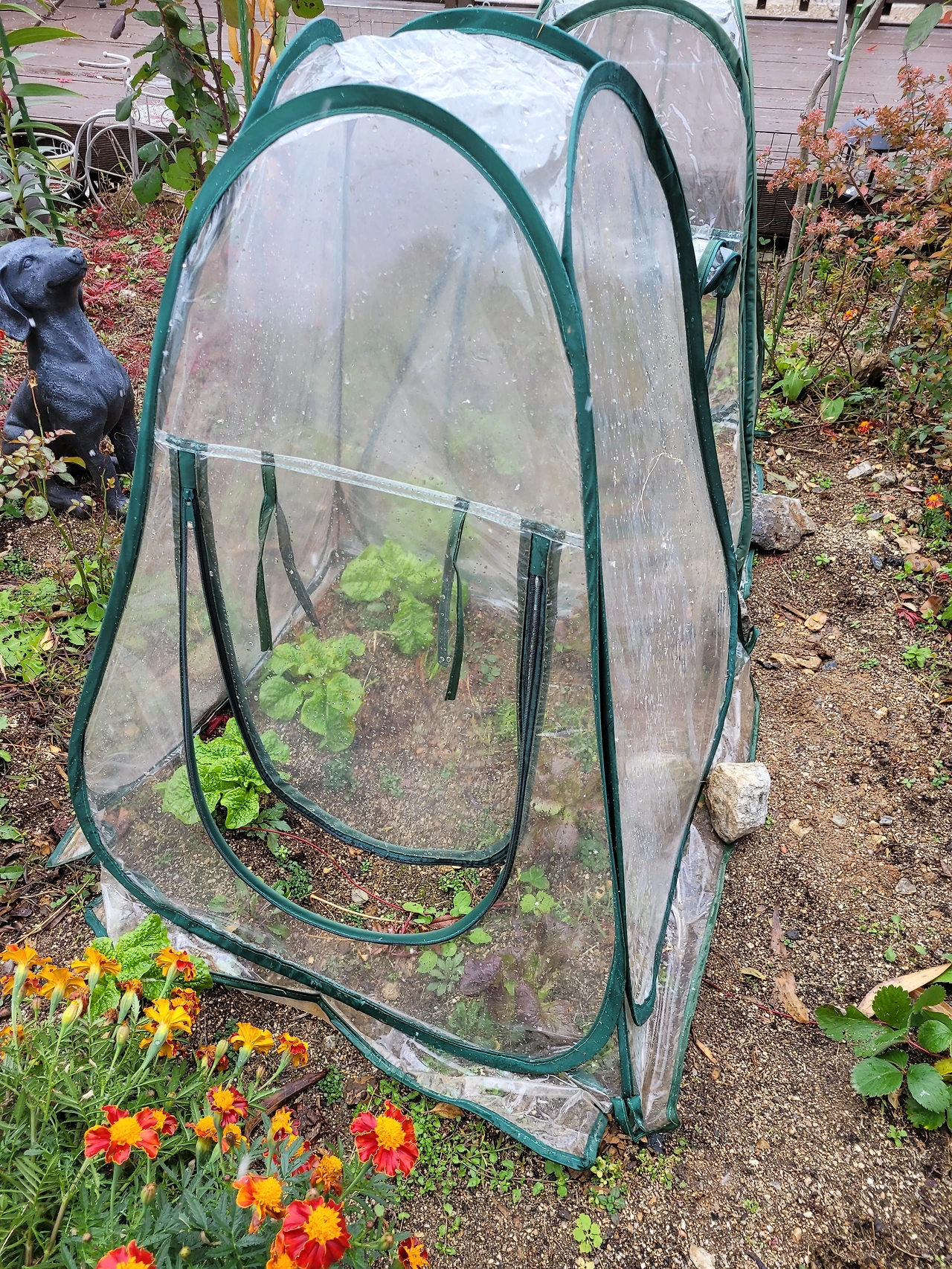 눈발이 날리는 바람 속에 상추가 염려되었다. 내일은 더 추워진다는데, 어차피 겨울까지는 아니더라도 있는 동안에라도 편히 자라게 해 주자는 마음이 들어 지지대를 세워 비닐을 씌울까 생각하다, 문득 작년에 작은 나무에 씌웠던 미니 온실이 생각나 상추에 씌워주기로 했다. 상추밭에 씌워놓으니, 생각보다 훌륭했다. 바람에 비닐온실이 날아가지 못하도록 돌을 많이 고여놓고 보니, 이 정도면 많이 추워지기 전까진 괜찮을 것 같다.