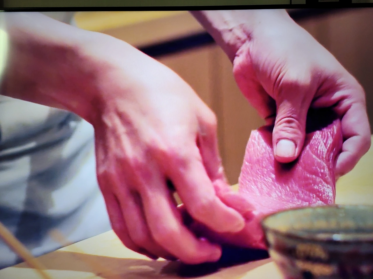"손님의 성별에 따라 초밥 크기를 달리 만듭니다. 같은 크기로 만들면 식사 속도가 달라, 여자 손님께는 작게 만든 초밥을 드려서 식사를 동시에 마치게끔 배려하죠. 남녀가 여기저기 섞여 있으면 헷갈리지 않나요? 일단 앉으신 순서를 외웁니다. 남자 여자 여자 남자 이런 식으로요, 손님이 왼손잡이면 초밥을 왼편에 내줘 손님 특성에 맞춰갑니다. 내가 왼손잡이가 왼손잡이 심정을 합니다."