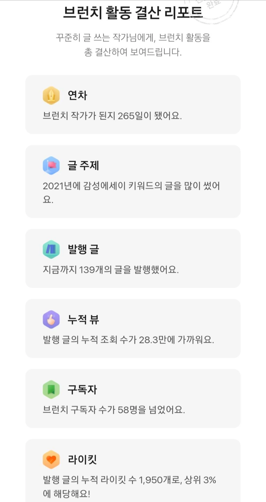 모든 브런치 작가님들께 보내주신 성적표더라고요.
