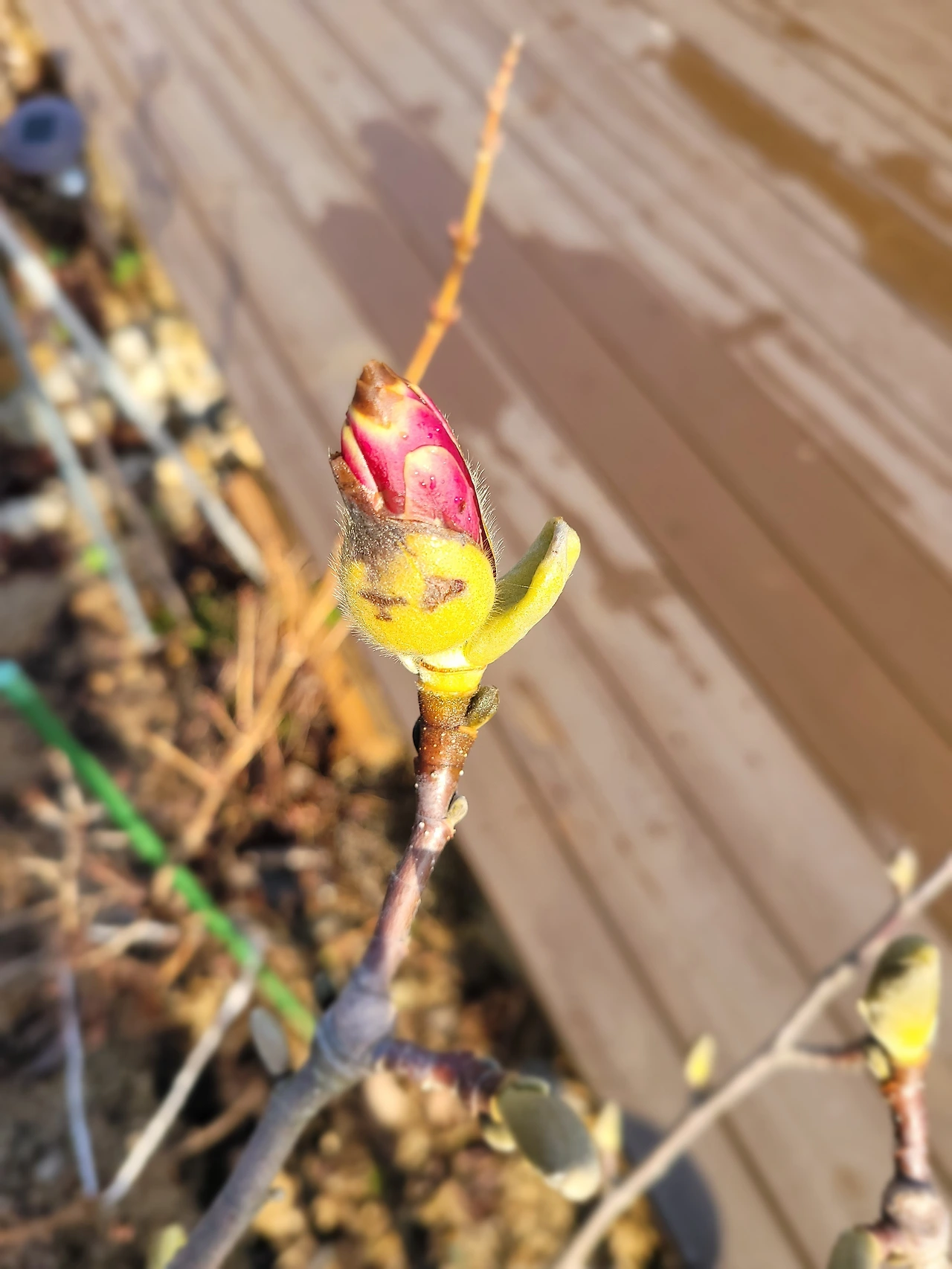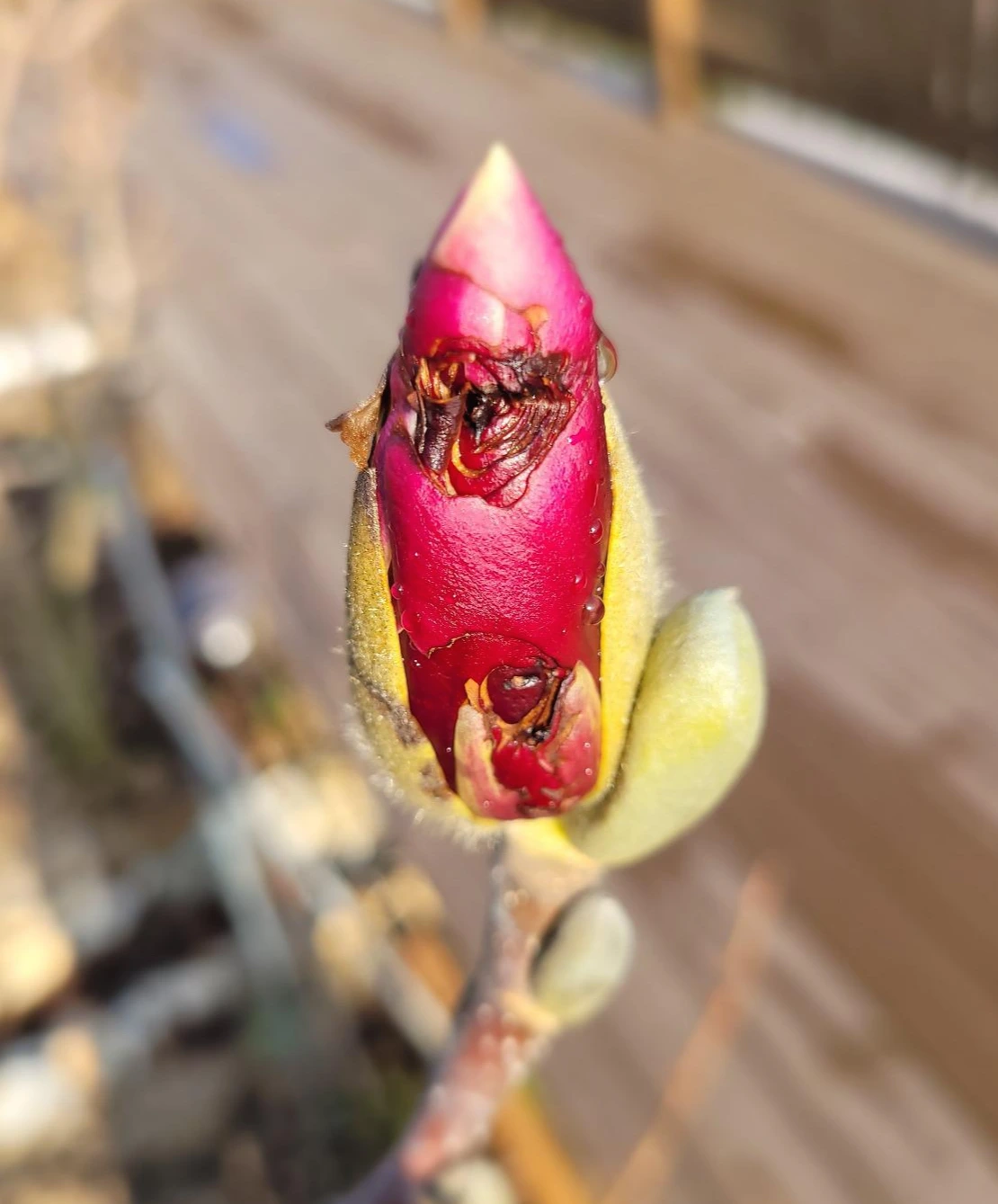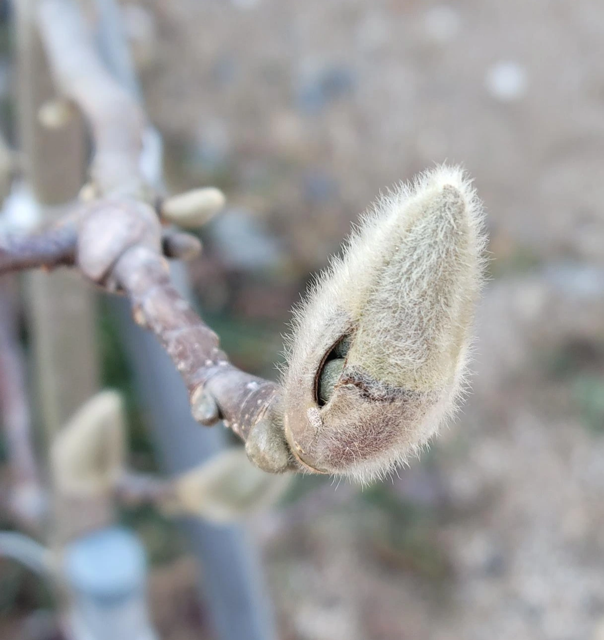 오늘 아침 자목련은 지난주 보단 더 벌어지고 이제 세상을 향해 두 팔을 벌릴 채비를 하는 듯하다.그런데 이게 웬일이람, 제일 큰 꽃몽우리가 상처를 입었다. 아마도 새들이 쪼은 것이 아닌가 싶다. 몇 달 전부터 새 모이를 주니 새들이 데크 주변으로 많이 몰려든다. "세상에, 은혜도 모르는 녀석들..." 이 아이는 꽃을 피우기 위해 일 년을 기다린 아이들인데, 이름도 모를 새가 쪼아버린 것이다. 그런데도 새에게도 꽃몽우리에게도 뭐라 할 수 없다. 그들은 서로 순응하고 있기 때문이다. 그게 자연의 모습인데, 제대로 꽃이나 피울까 안쓰럽게 여기는 나를 오히려 이상하게 보는 듯하다. 자연 속에 살고 있다면서 아직도 동화되지 못한 나만 어색해 보인다.