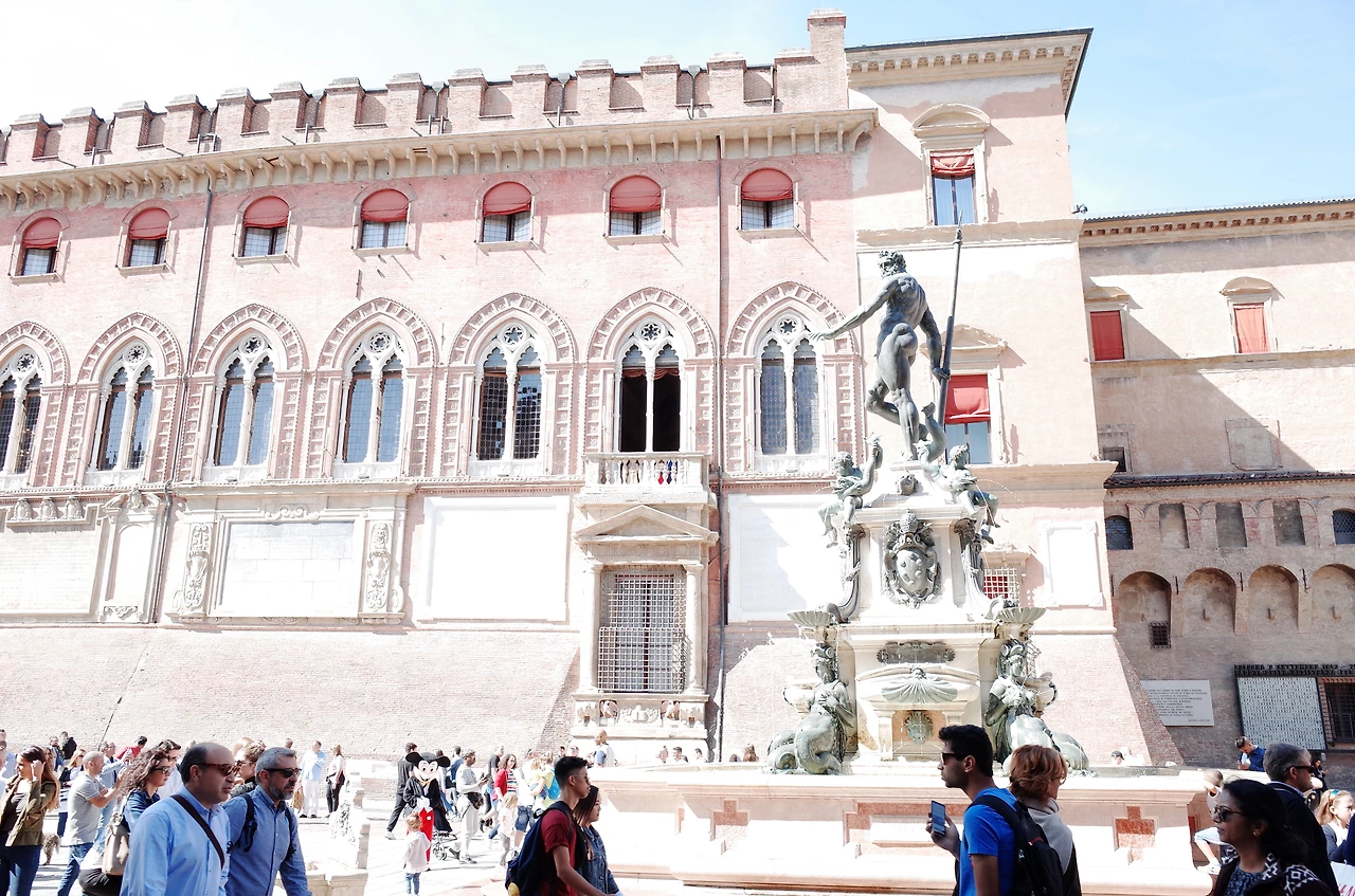 시청사와 산 페트로니오 성당이 있는 볼로냐의 중심 마지오레(Maggiore) 광장에는 볼로냐 시민보다 각지에서 온 관광객이 더 많았던 것 같다. 우리도 즐겁게 다니면서 광장의 중심에 있는 넵튠 분수대 옆에서 사진을 찍는다. 광장의 남쪽 끝은 산 페트로니오 대성당, 대성당 맞은편에는 포데스타 궁전이 있고, 서쪽은 현재 시청사인 코뮤날레 궁전이며 광장 중앙에는 16세기에 만들어진, 삼지창을 들고 위풍당당하게 서있는 해신 넵튠의 분수대가 있다. 분수대는 사이렌과 바다의 요정들에 둘러싸인 선정적인 모습이다. 아름다운 광장은 시민들의 휴식처요, 약속 장소로도 사랑받으며 또한 볼로냐 여행의 기점으로도 많이 이용된다.