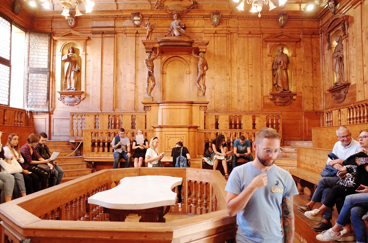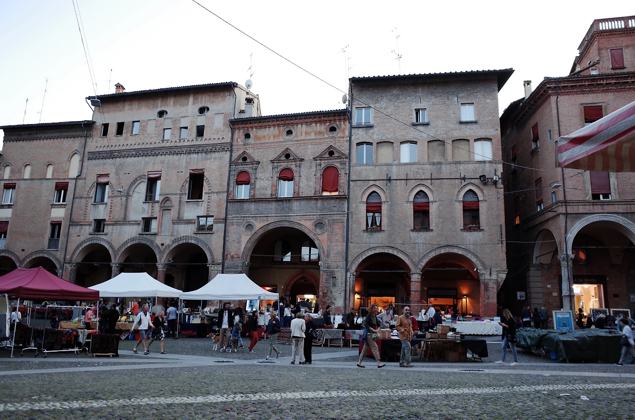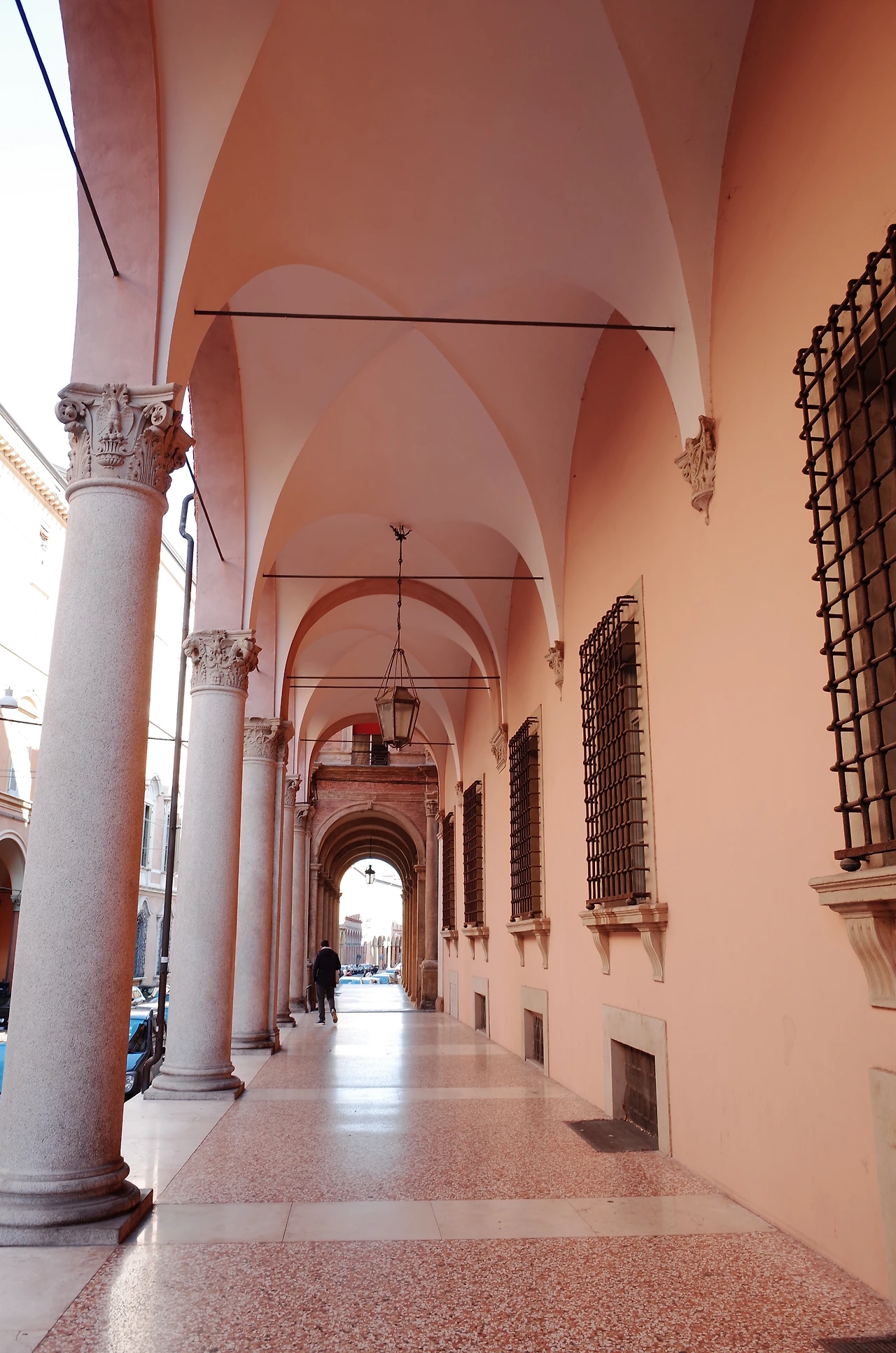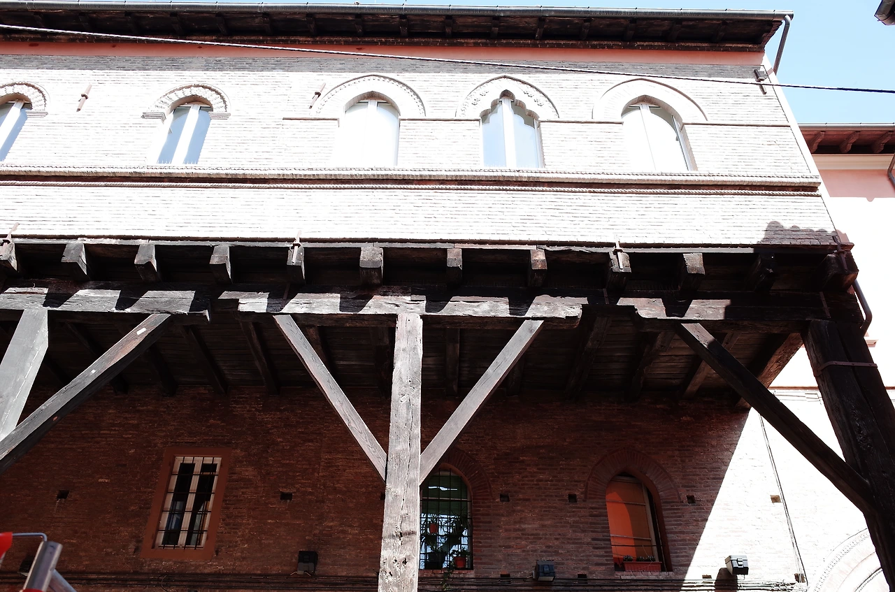 도보로 구 시가지를 걸어 다니면서 설명을 듣는다. 기둥 사이를 걷는 중 레시 씨가 길 밖으로 나와 보라고 한다. 길에 서서 보니 천장을 받치는 나무 기둥 위에 집이 있다. 목조 "포르티코"라고 부르는 아케이드 같은 것이다. 볼로냐는 "포르티코의 도시"라 할 정도로 포르티코가 많았다고 한다. 석조 포르티코도 많지만 특이하게 목조로 된 포르티코도 많았다. 볼로냐대학에서 공부하는 학생들을 위한 방을 만들 목적으로 밑에는 사람들이 다닐 수 있는 길로, 위로는 집을 꾸민 것이다. 도로 옆 건물에는 상가를 지어 사람들이 이용하도록 했는데, 오래된 목조 포르티코가 아직도 건재한다는 사실에 놀라울 따름이다. 먼 옛날 그곳에서 공부했던 가난한 대학생들의 꿈과 희망을 아직도 서려 있는 듯한 건축물을 본다.