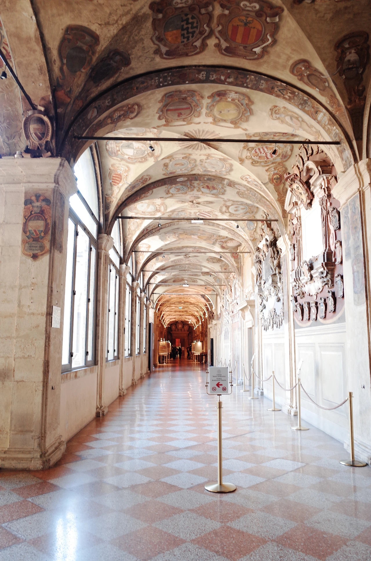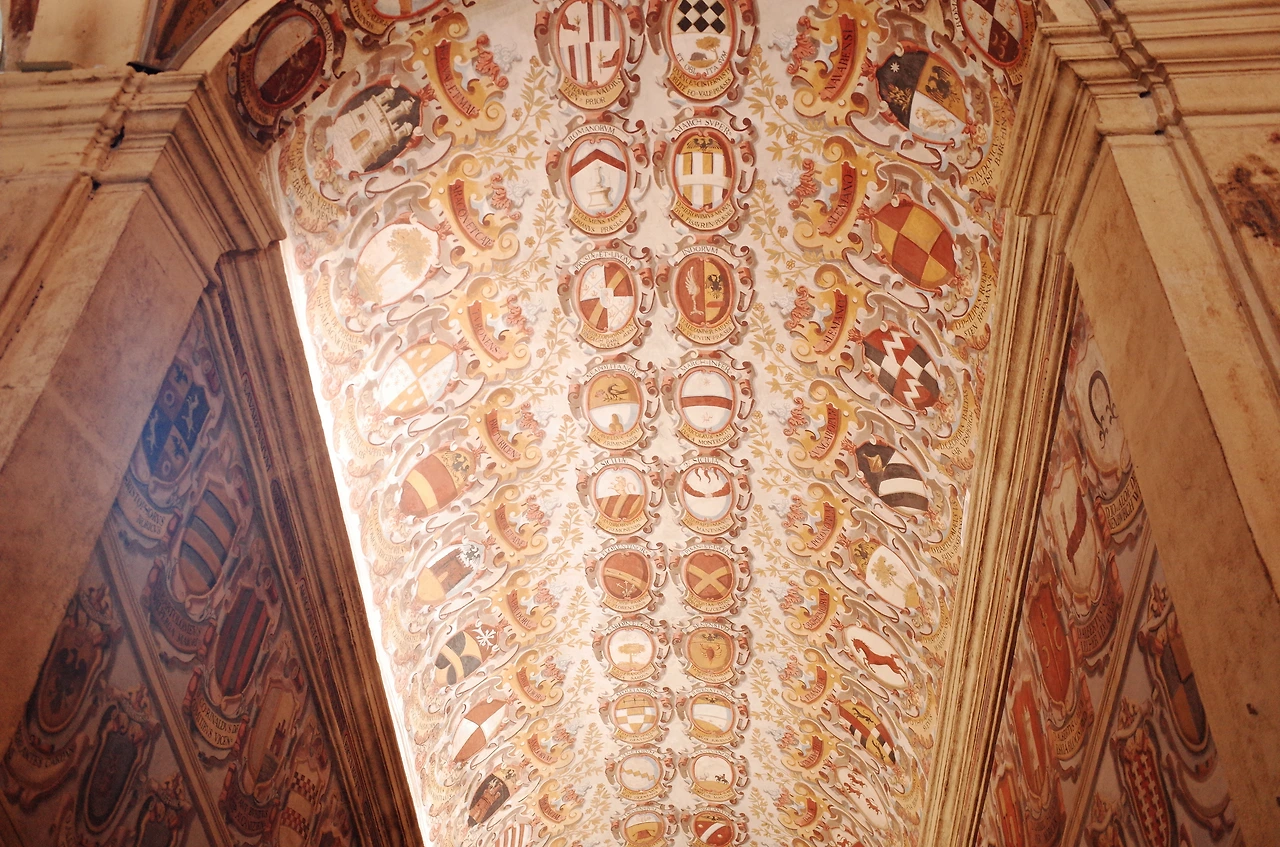볼로냐 대학의 천장으로 벽으로 이어진 수없이 많은 문장들