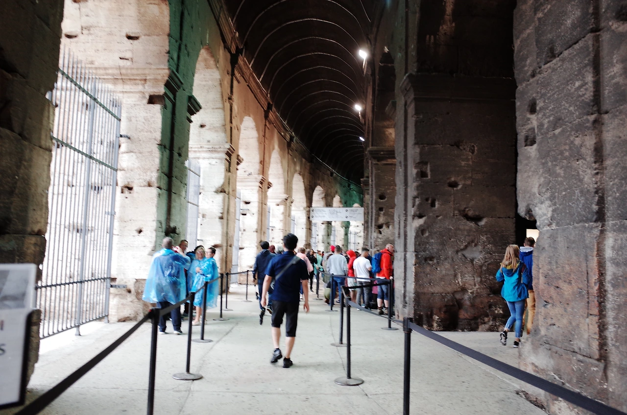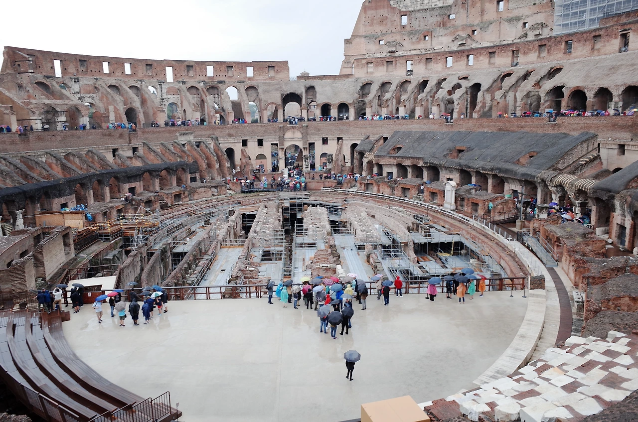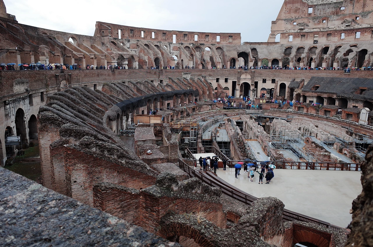 여러 해 전 왔을 때는 기다리지도 않았던 것 같은데, 비 오는 날이지만 엄청난 사람들 덕에 한참을 기다려 낡은 돌계단을 올라간다. 오랜 세월 동안 어떤 일들을 겪었을까는 굳이 말할 필요도 없다. 성한데 한 곳 없는 구멍 난 기둥들은 온몸으로 역사를 말해주는 듯하다. 떨어져 나간 벽들, 곳곳의 상처가 있지만 어마어마하게 넓고 큰 공간은 언제까지라도 갈듯이 당당하게 버티고 있다. 고층으로 올라가 내려다보니 거대한 인간 제국의 역사를 한 장의 파노라마로 보여주는 것 같다. 세월에 파손되어 허물어지긴 했어도 곳곳에서 복원이 이루어지고 있는 모습도 마음을 무겁게 한다. 운동장 바닥이 파손되어 아래 지하 부분이 드러나니, 새삼 오래전 사람들이 이다지도 지혜롭게 구상하고, 거대한 구조물을 세우고 완벽하게 운영을 했다는 사실에 경외감까지 든다. 거대한 콜로세움은 굴복하지 않는 인간들의 역사와 끝까지 싸우는 투지의 결합체로 남아있는 의지의 산물이었지만 한편으론 얼마나 많은 사람들이 원치 않는 고통 속에서 자유를 그리며 사라져 갔을까 싶다.