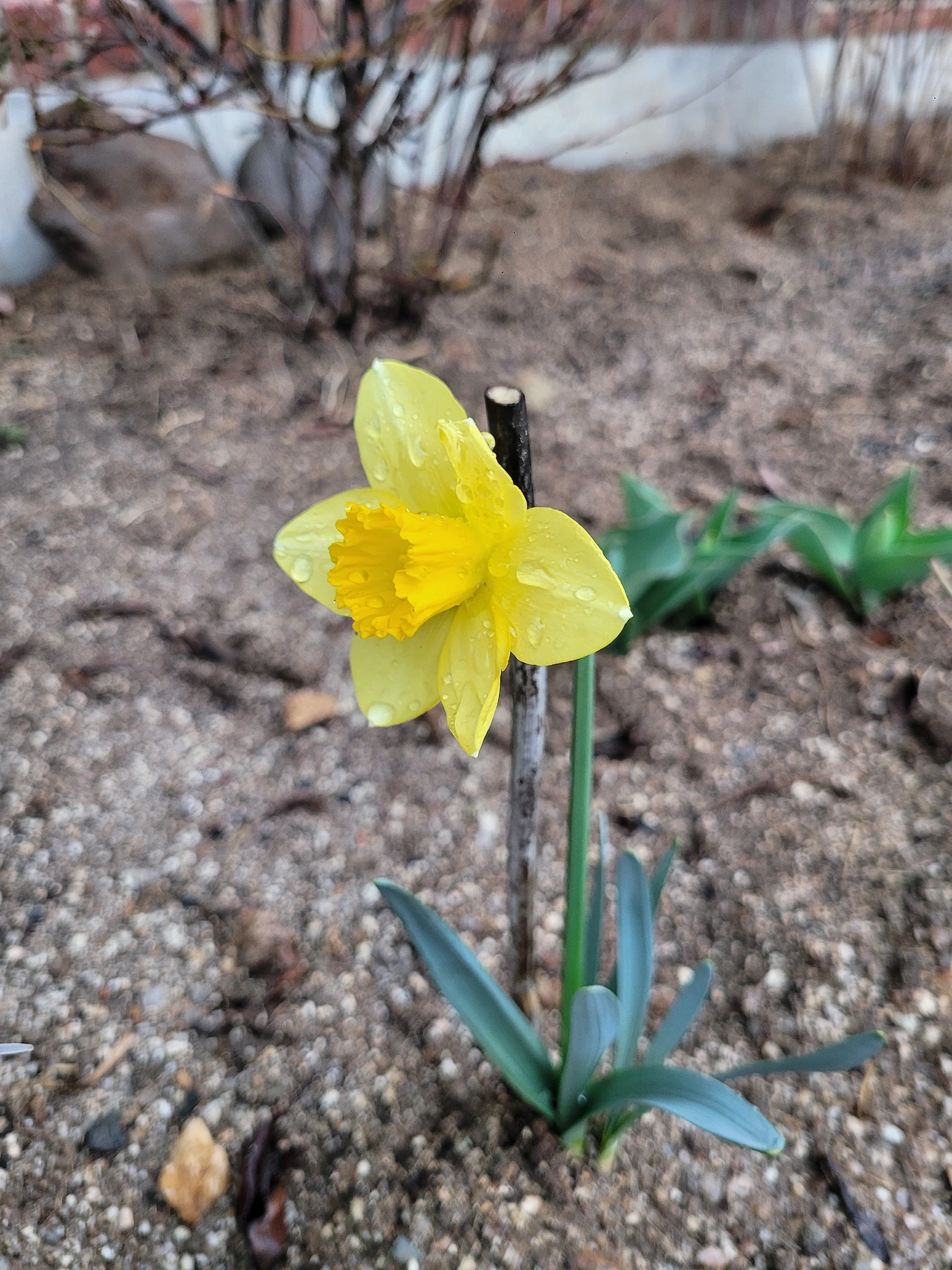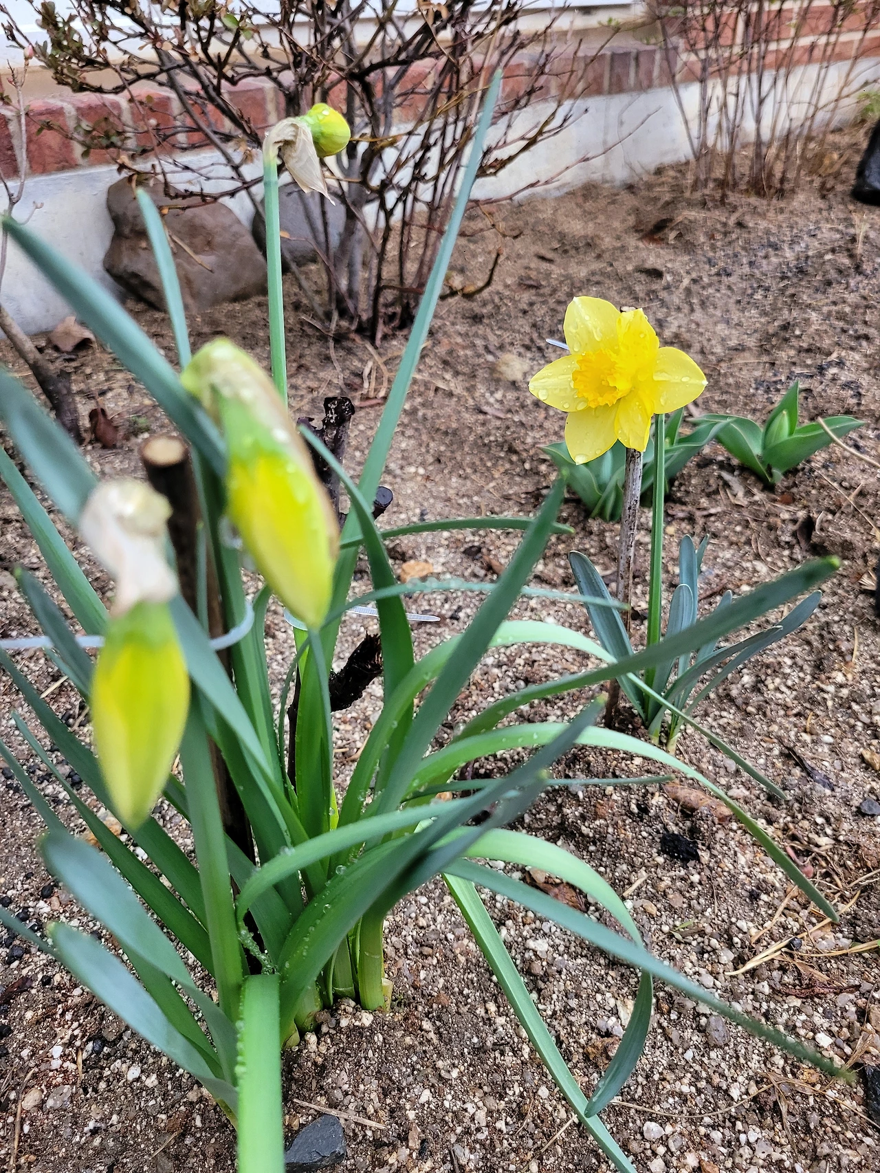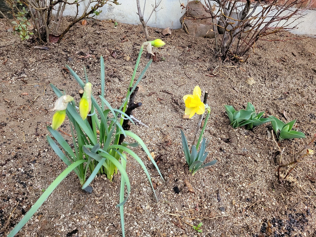 집안에 들어와 보니 거실 앞마당에 심어둔 수선화가 꽃을 피웠다. 한 번에 하나만 아는 단순한 스타일이라 염려되었던 부분만 보고 들어와서야 방긋 핀 노란 수선화를 본 것이다. 급히 나가 쪼그리고 앉아 얼굴을 본다. 이 주 전 앞마당에 잔디와 잡초를 제거하고 작은 화단을 만들어 꽃대가 올라온 수선화를 옮겨 심었던 것인데, 꽃을 피우지 않아 혹 꽃도 못 피고 그대로 지는 것은 아닐까 염려되던 아이였는데, 어제 낮에도 고개 숙인 채로 있던 아인데 간밤 요란한 바람 속에서 제 얼굴을 보여 준 것이다.