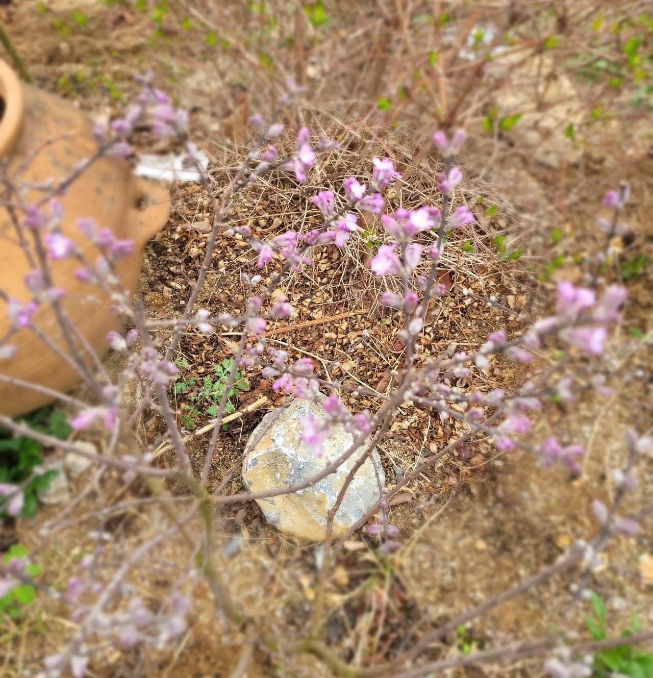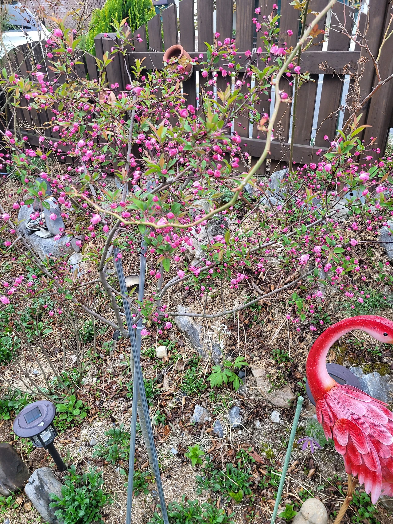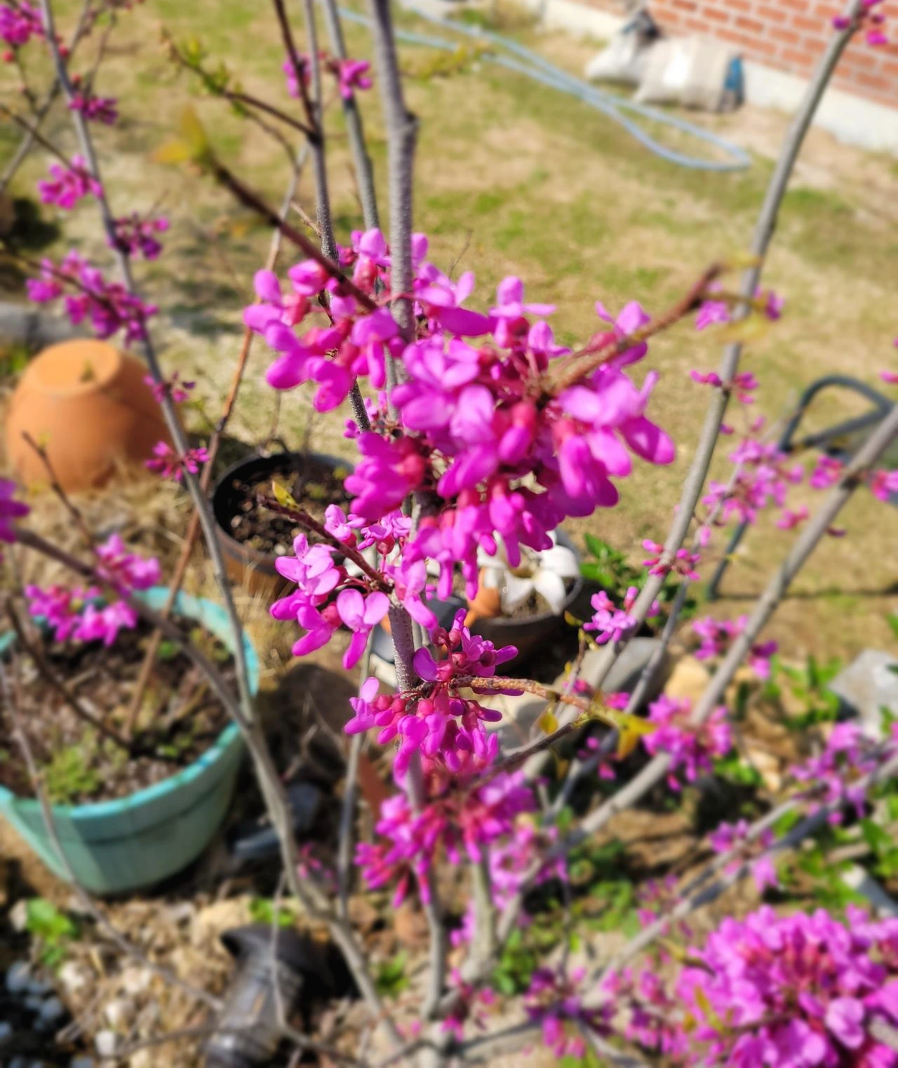 뒷마당 쪽엔 팥꽃나무가 보라꽃을 피우기 시작했고, 만나고 싶었던 박대기 꽃은 꽃분홍색 자태를 한껏 뽐내며 몽우리가 터지기 시작했다. 일상생활에서라면 너무나 화려하고 촌스럽다고 까지 할 그런 분홍색 꽃을 피우기 시작한다. 예뻐도 너무 예쁘다. 노랗고 분홍 꽃 잔치, 건너편엔 점잖고 고고하기까지 한 진달해의 연분홍 자태, 막 잎이 터지는 나무들의 여린 연둣빛 신록은 세상이 달라지고 있다는 것을 말하기라도 하듯, 본 적도 없는 색으로 눈과 마음을 감동시킨다.