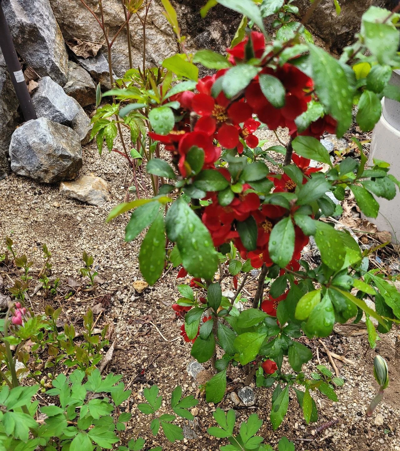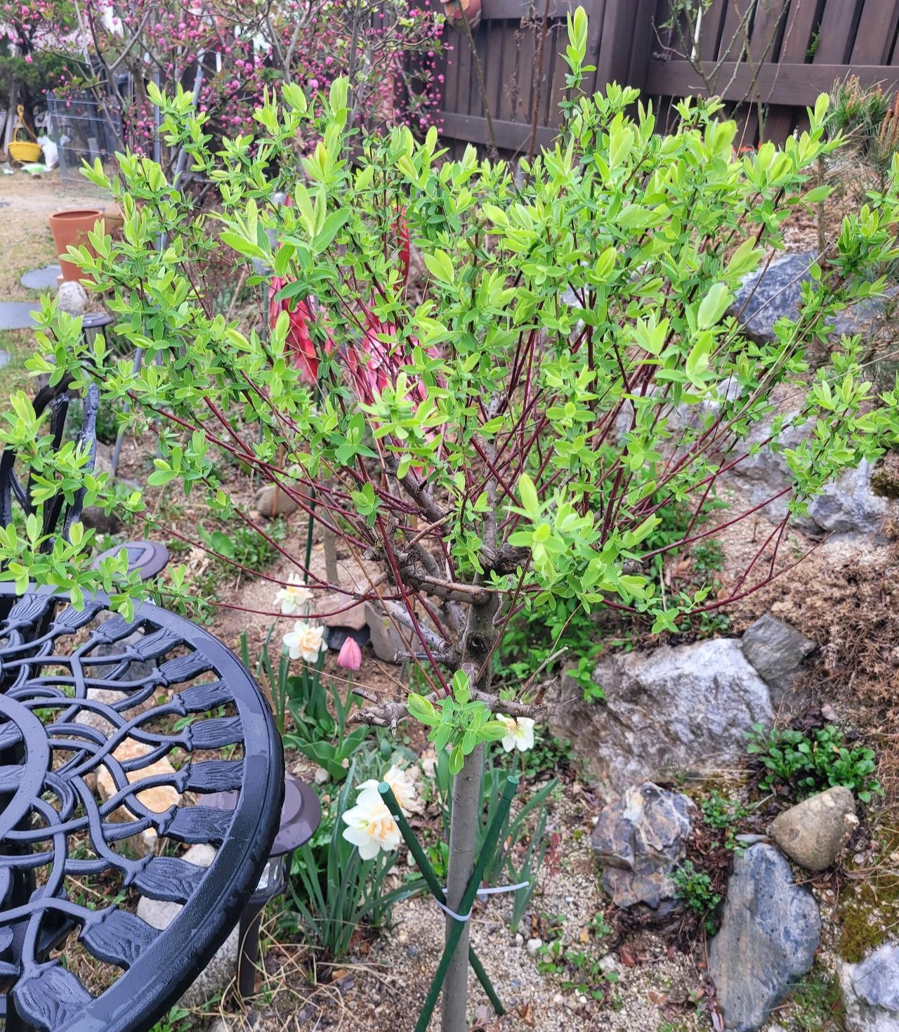 지난주 새로 들여온 노랑 미 산딸나무는, 멀리 거제도에서 올라왔음에도 불구하고 심은 다음날부터 꽃 몽우리를 벌리기 시작하더니 이제는 활짝 벌어져 알알이 노란 속살이 보인다. 이번 주엔 노란 얼굴로 환하게 웃을 것 같다. 앞 정원의 붉은 산딸나무도 겨우내 품었던 꽃몽우리를 벌려 하늘을 쳐다보고 있으니 머잖아 홍조 띤 얼굴을 볼 듯 싶다.
