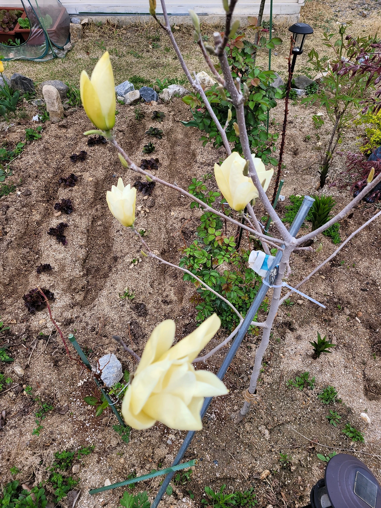 노랑 목련은 습자지 같이 얇고 투명한 몸뚱이를 피웠다. 몇 주간을 참고 버티더니 드디어 얼굴을 드러낸 것이다. 나무가 꽃몽우리를 내고 품고 있는 것은 생명을 잉태하고 해산하기를 기다리는 동물들과도 같다. 마지막 해산의 고통이 있어야 새 생명을 맞이 할 수 있는 인간처럼 꽃도 나무도 마지막 몽우리를 열고 꽃을 펴내는 순간이 가장 힘들고 에너지를 많이 필요로 하는 순간이다. 노랑 목련이나 미산딸 나무도 그 순간을 위해 온 힘을 다 쏟아붓고 있는 것이다.