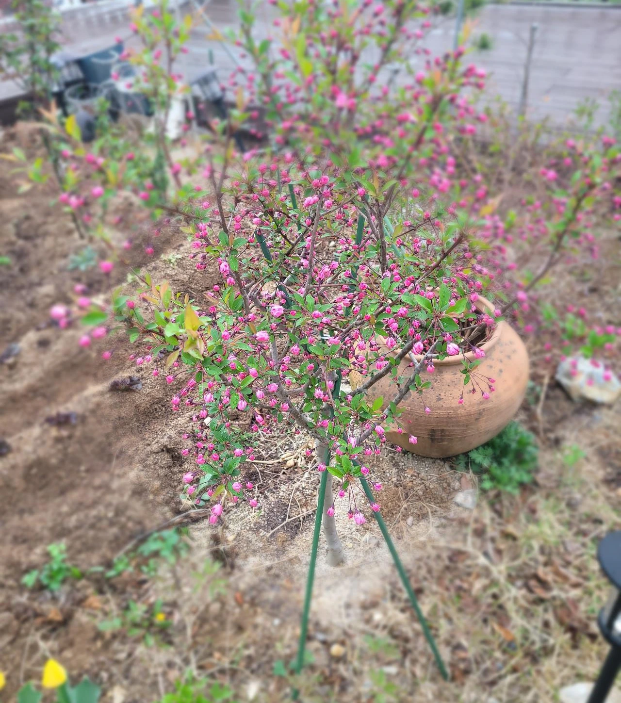 서부해당하는 이주일 째 빨간 꽃 몽우리를 매달고 있었는데 아침에 나와보니 꽃이 피었다. 분홍꽃을 주렁주렁, 마치 분홍 열매를 달고 있는 것처럼 아름답게 피었다. 화이트셀렉스는 연두 아기 잎은 훌쩍 컸다.