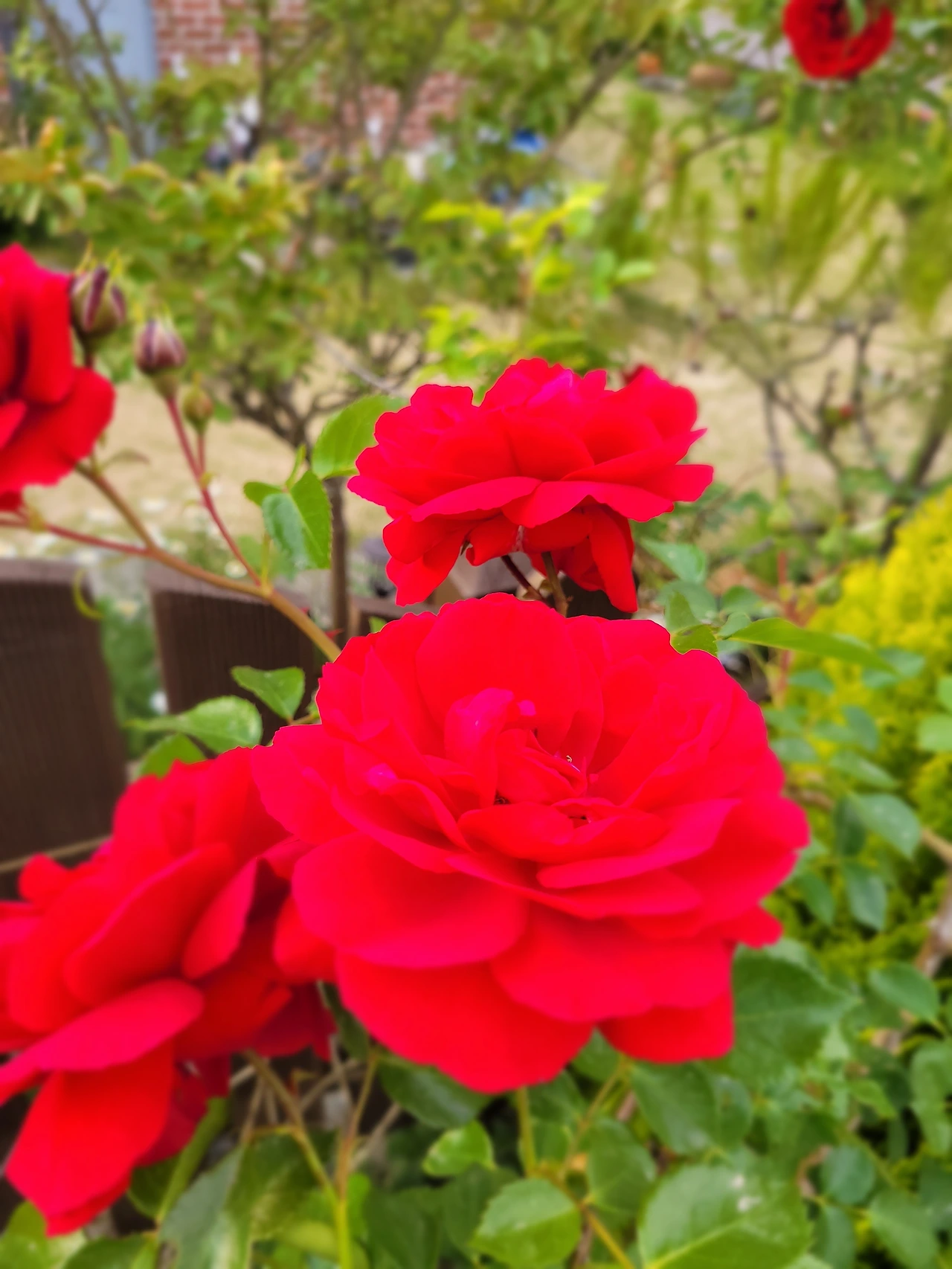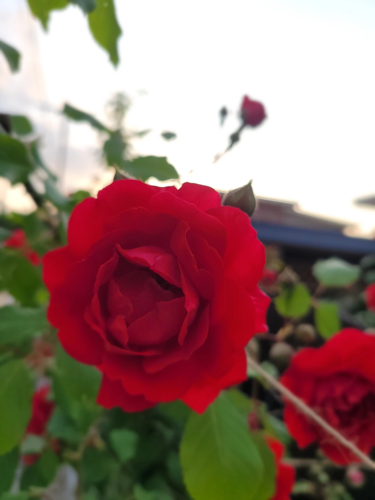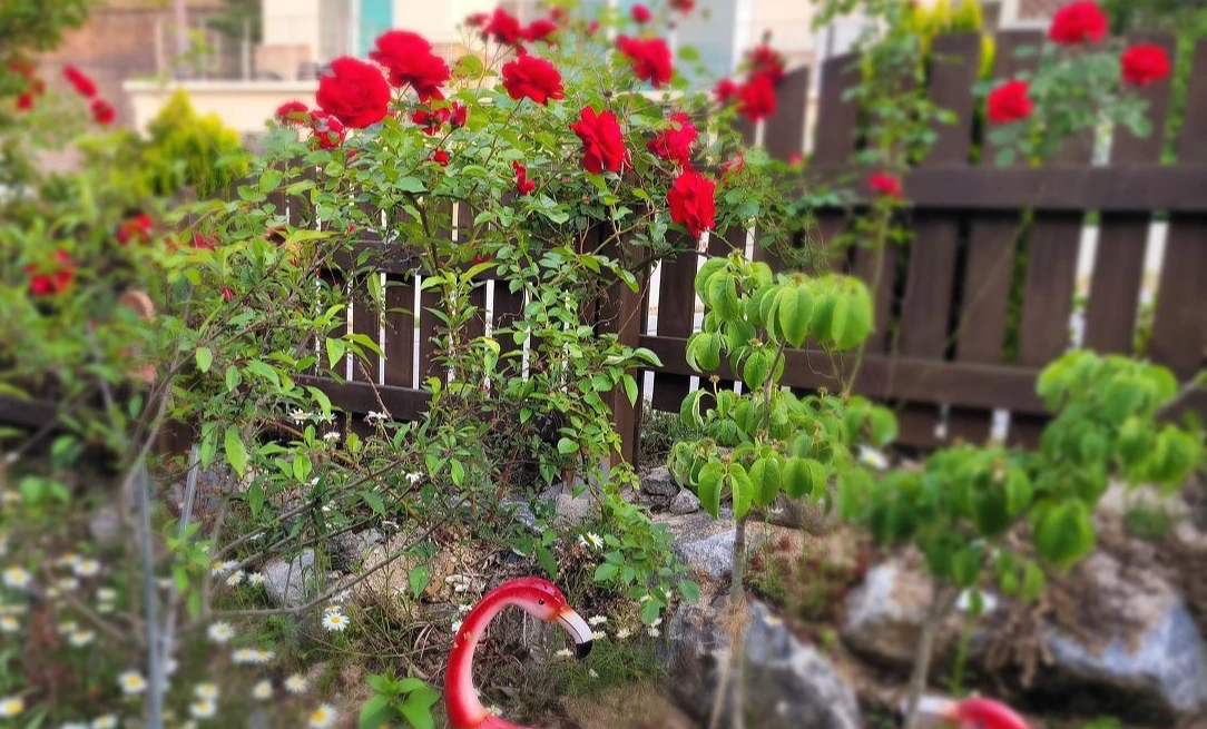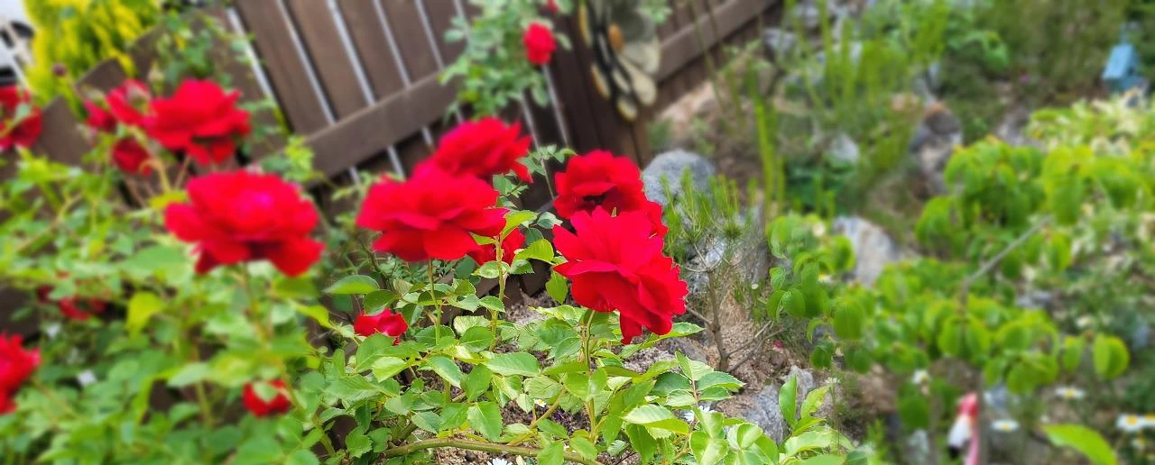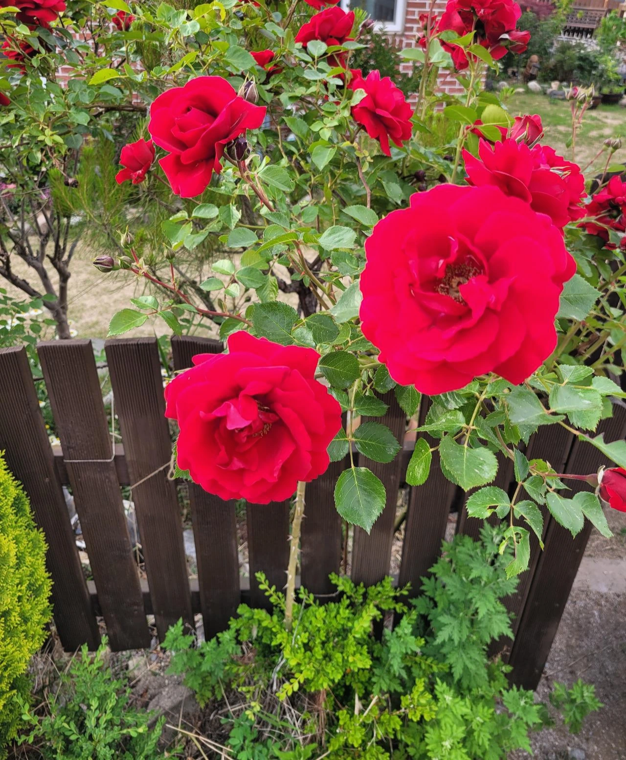 담장 울타리 장미가 활짝 피었습니다. 올해처럼 탐스럽고 아름답게 핀 적이 없다 싶을 정도로 많이 피었습니다. 빨간 장미지만, 가지를 뻗히며 올라가는 여덟 그루의 장미의 옷 색깔은 빨간색이 한 가지가 아니라는 것을 보여주듯 조금씩 다른 서로의 느낌을 보여 줍니다.