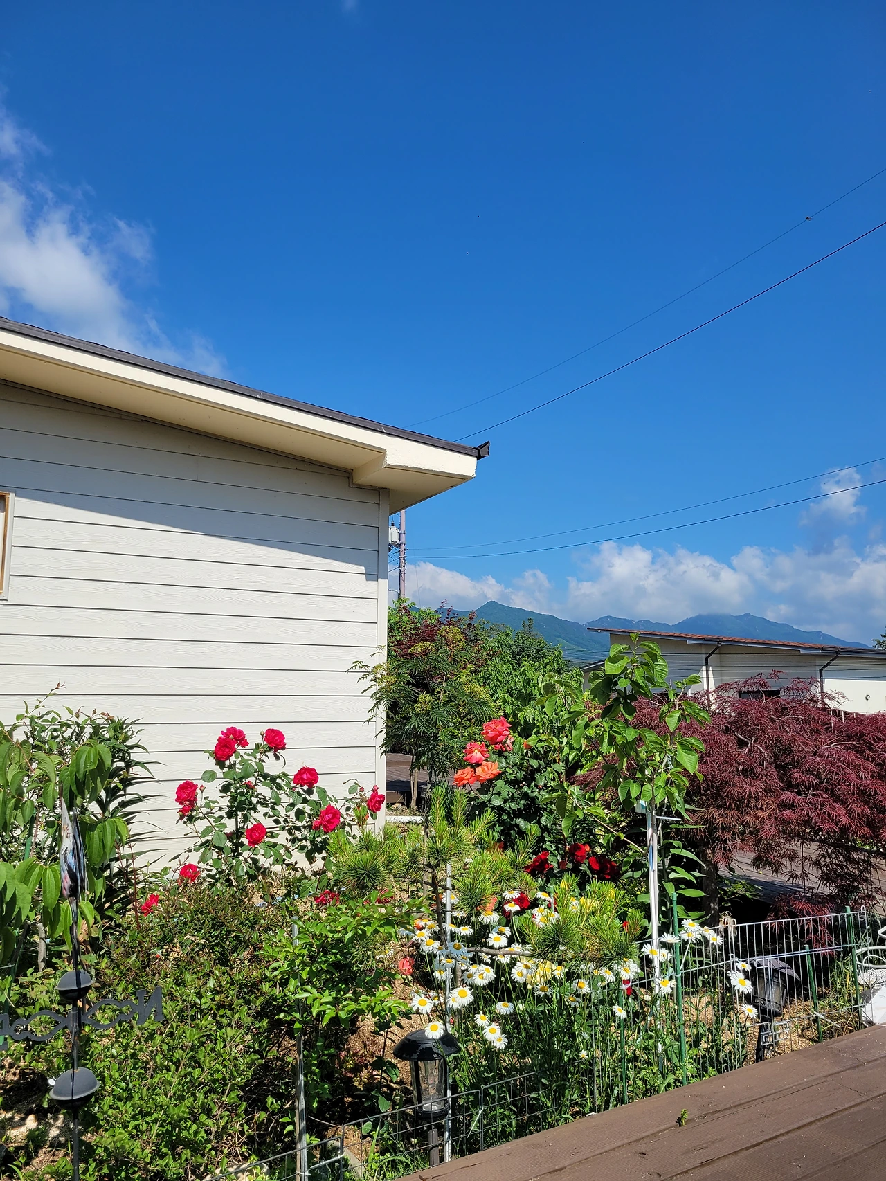 데크를 걷다 붉은 장미와 주황 장미가 어제보다 더 활짝 피고, 생생한 것을 본다. 장미꽃 앞으로 중간에 둔 의자에 앉아본다. 그동안 보던 것 과는 또 다른 느낌을 준다. 의자에 앉아 머리를 데크 난간에 기대고 고개를 하늘로 향한다. 녹음은 사라지고 온통 파란 물감을 펼쳐놓은 듯 하늘 바다가 보인다.
