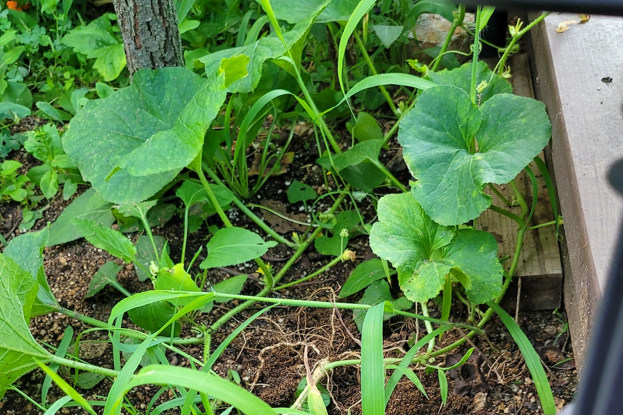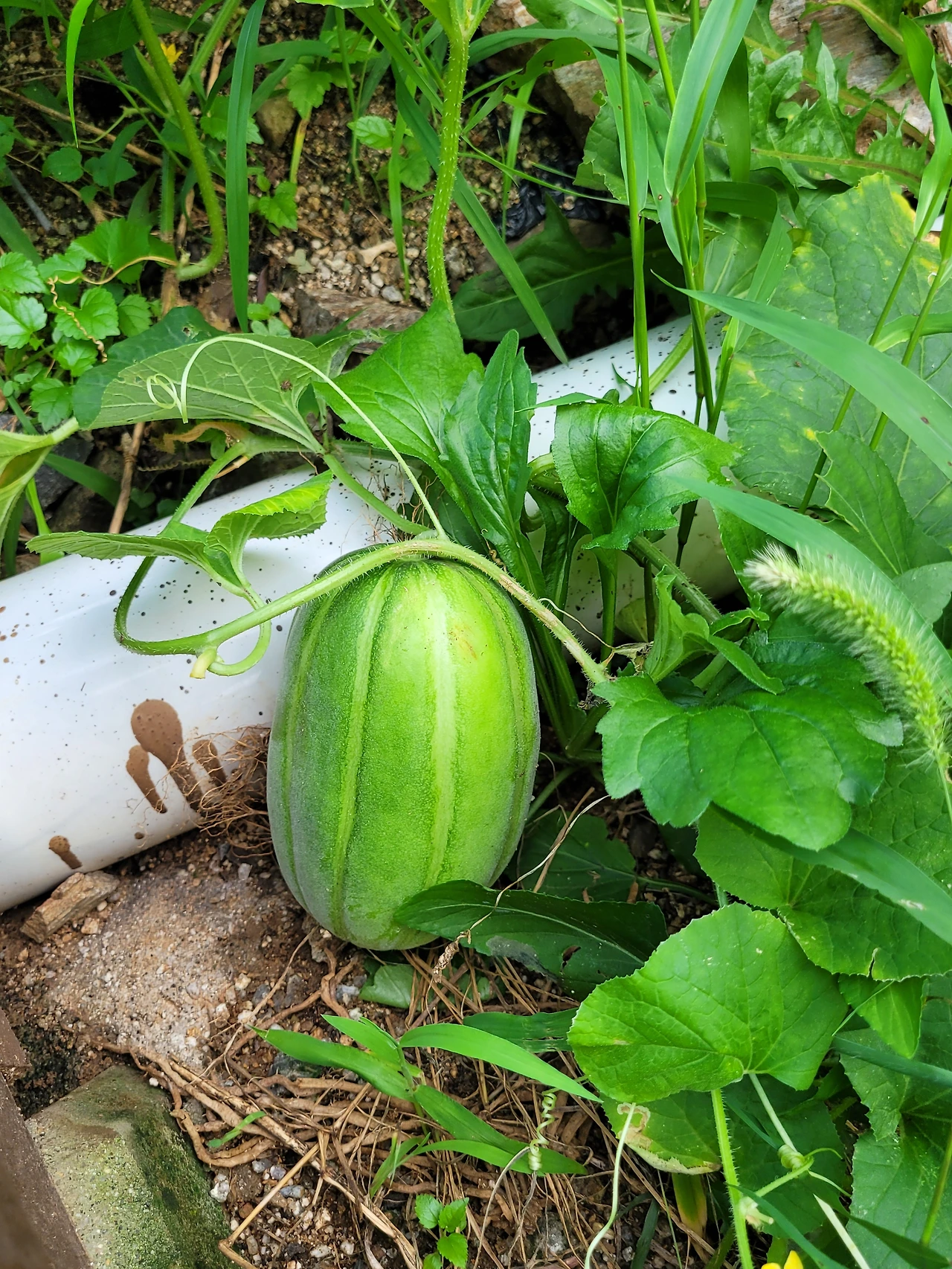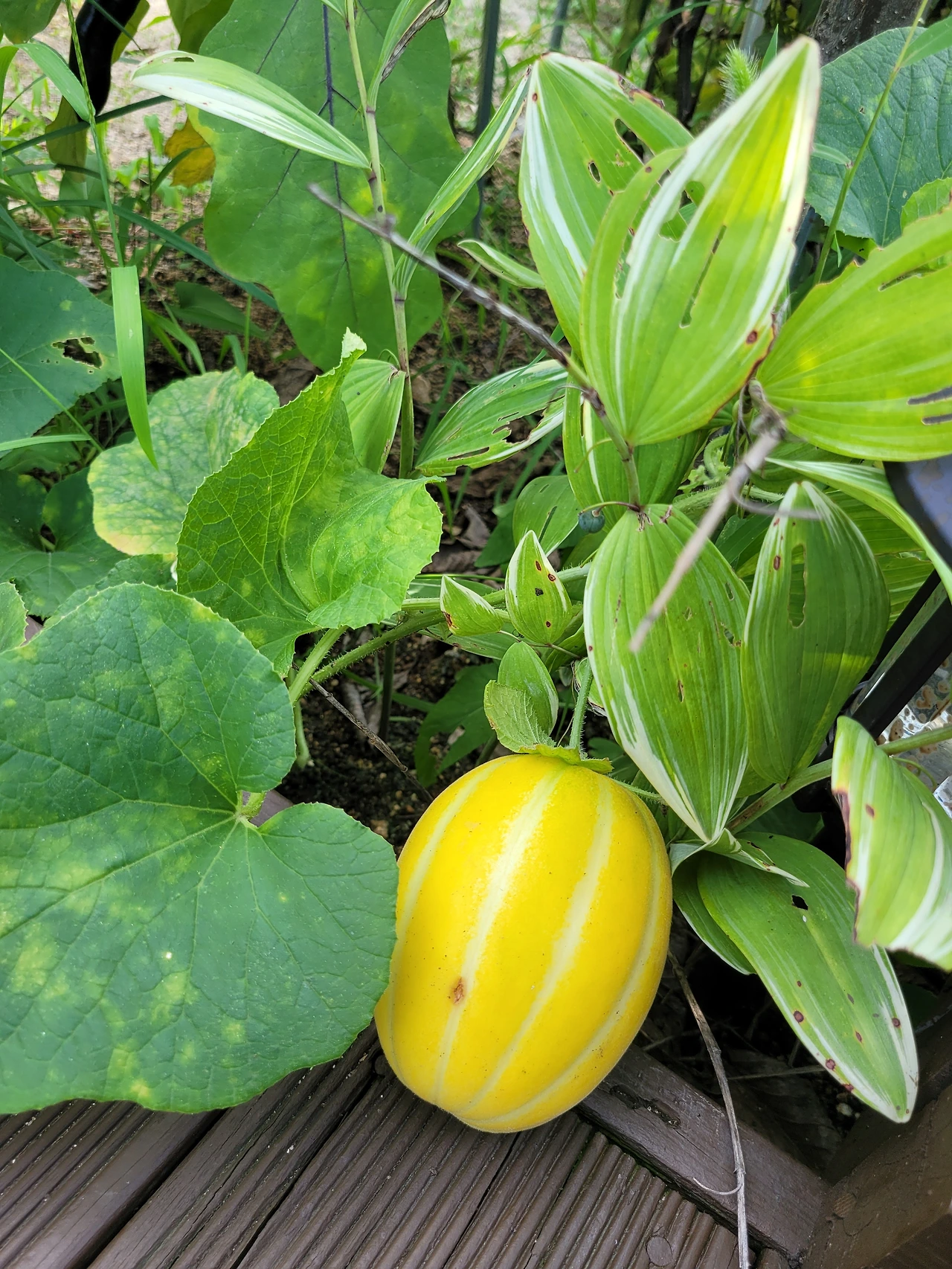 다른 야채들이 자라고 열매를 맺어 식탁을 풍성하게 할 때도 참외는 달리질 않아 가끔 참외 잎을 들춰보면 꽃은 열심히 피우고 있었지만 토마토 같은 열매를 보진 못했다. 데크를 따라 누워가는 참외는 잎을 크게 키우고 꽃도 많이 폈지만, 열매가 달린 것은 보지 못했다. 전주인가? 열심히 찾아봤을 때도 정말 아기 손톱보다 작은 열매를 달고 있는 것을 보고, 참외는 아직 키울 처지가 안되나 보다 싶어 내년에는 잎만 지저분하게 늘어져 가는 참외는 심지 않으리라 생각도 했었다.