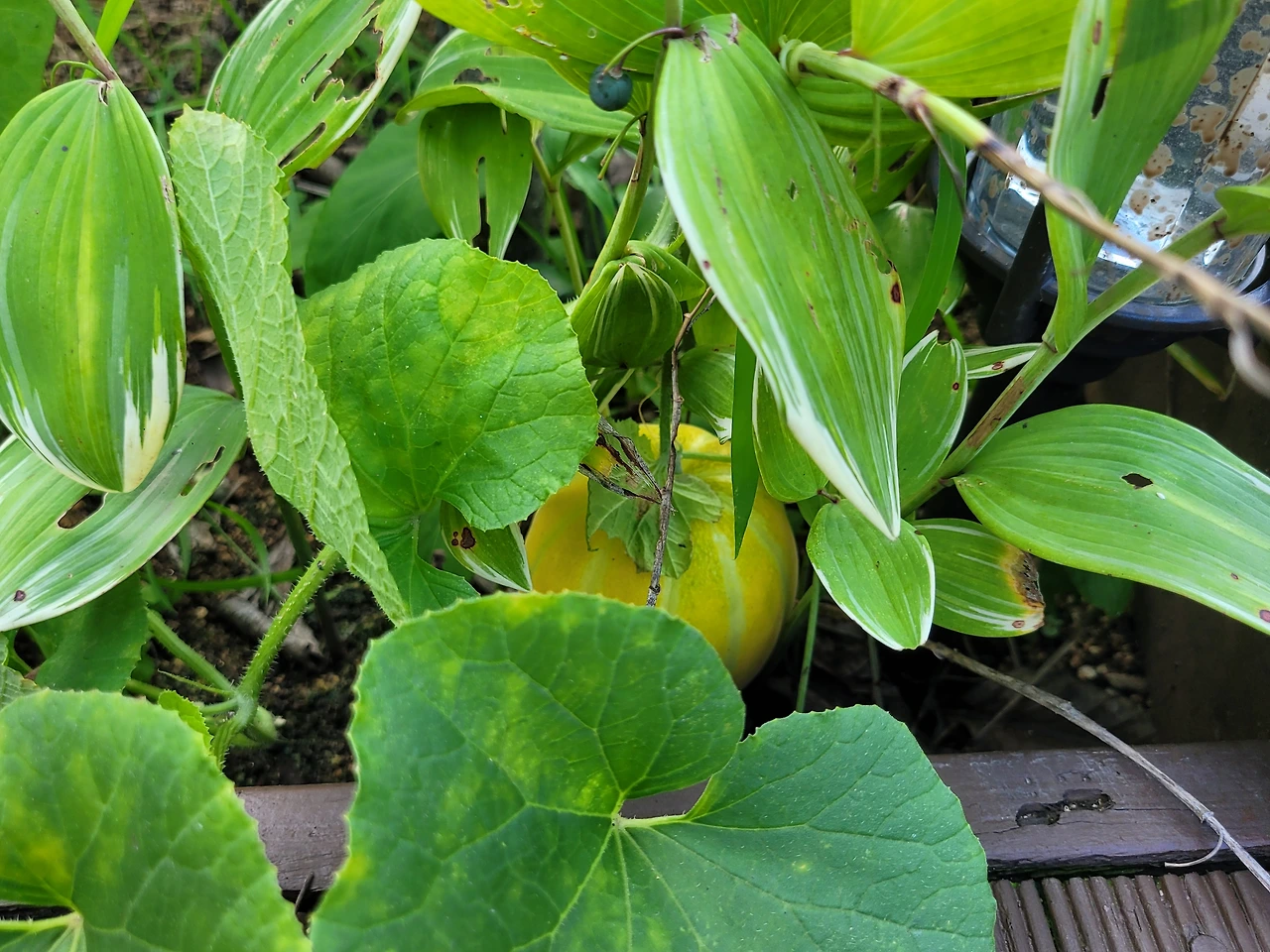 그런데 이렇게 큰 참외가 자목련 아래, 둥굴레 옆에 숨어 노랗고 튼실하게 자리 잡고 커가고 있었던 것이다.