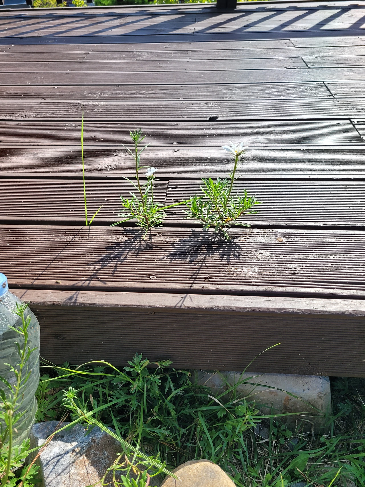 데크 틈새를 비집고 나와 기어이 꽃을 피우고 마는 이름 모를 들꽃도 생명의 이어짐을 고통 속에도 보여준다.