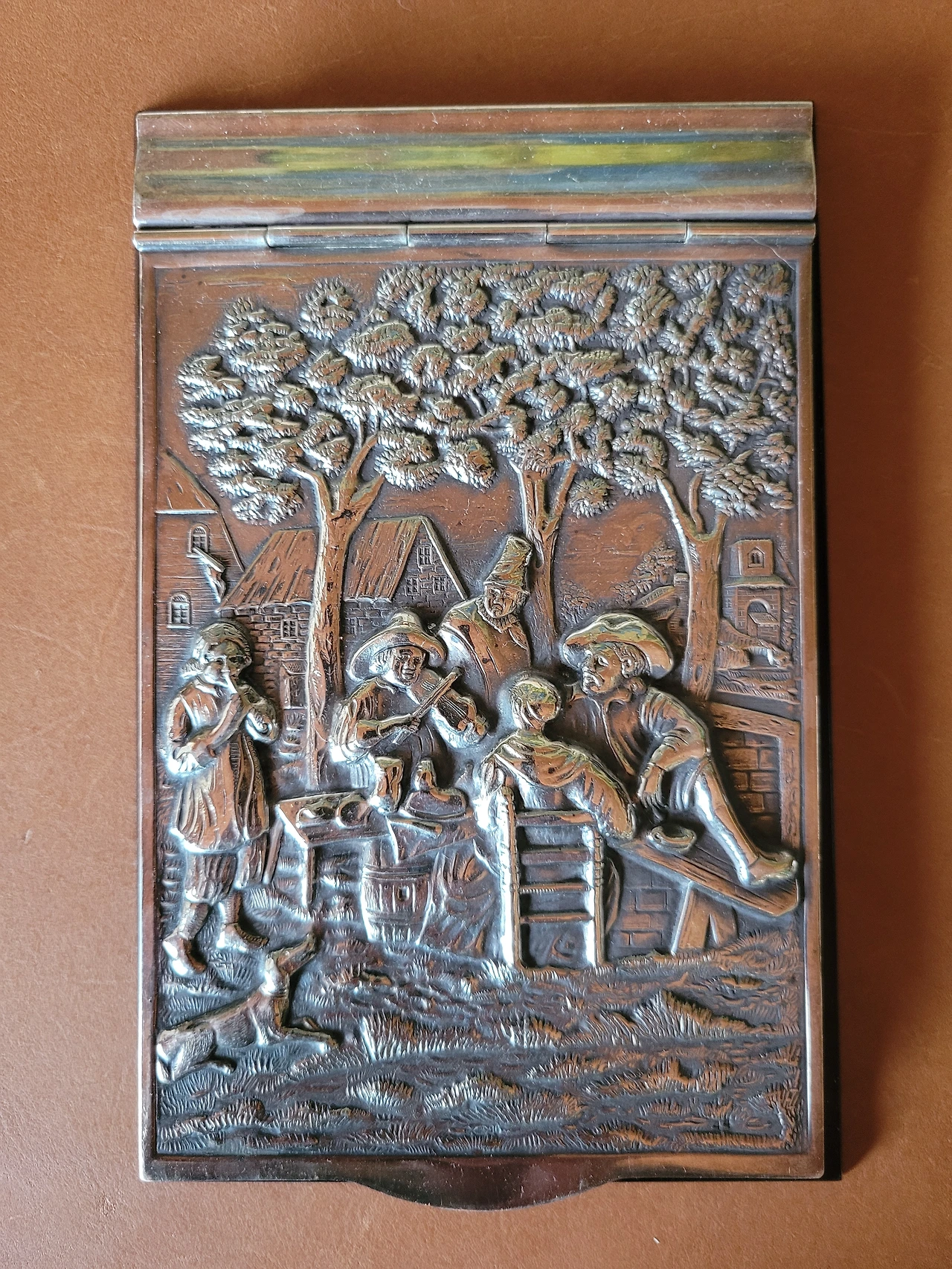 앤틱 코너에서는 가격이 다양했고, 몇십 년에서 백 년이 넘은 제품도 많았다. 검색을 계속하다가 "지금도 잘 갑니다"라는 문구에, 가격도 적당한 것 같아 자그마한 회중시계를 주문했다. 버밍엄(Birmingham L 1885) 제품으로 내가 사고자 하는 것의 제작연대는 1900~1909년도 사이라 한다. 예쁘게 새겨진 은 케이스에 에나멜 무늬가 있는 자그마한 회중시계였다. 개인적으로 경매보다 즉시 구매를 선호하는 편이라 가격을 지불하고 2주 동안 들뜬 마음으로 기다렸다. 키덜트는 아니지만, 키덜트 못지않게 기대감을 가지고 피규어를 기다리는 심정으로... 그리고 메모지를 두는 패드도 하나 구입했다. 악사들이 음악을 연주하면서 즐거운 시간을 보내는 모습을 양각한 실버 플레이트 메모패드 케이스였다. 구입하게 된 결정적인 것은 악사의 발아래에서 함께 즐거운 시간을 보내는 개가 있었기 때문이었다.