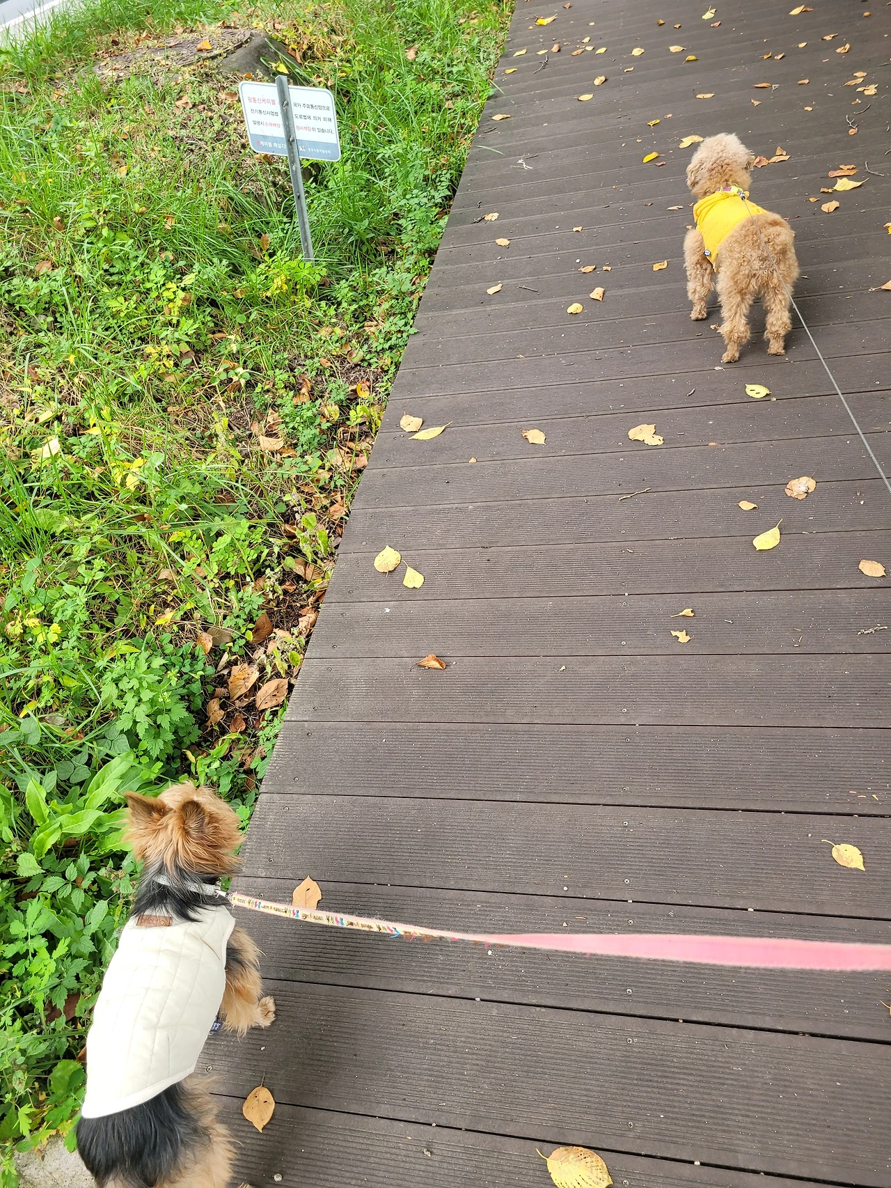 이른 아침 산책은 하루 중 빠질 수 없는 중요한 일과 중의 하나다. 샐리는 산책시켜보면 자기 하고 싶은 대로 하고자 한다. 평소에도 그렇지만 보리가 킁킁거리고 냄새 맡고 있으면 잽싸게 쫓아가서 그 자리에 흔적을 남긴 후 자기가 먼저 냄새를 맡는다. 가기 싫으면 아무 데나 주저앉는다. 가슴 줄을 두어 번 당겨야 마지못해 따라간다. 그러다간 금방 언제 그랬냐는 듯, 발랄 그 자체로 경쾌하게 걸어간다. 한 가지 부러운 점은 제가 저질러놓고도 인식을 못하는 것인지, 필요에 따라 잘 잊는 것인지, 도무지 고민이 없다(없어 보이는?)는 것이다. 나중에 두고 삭히며 고민하는, 나 같은 인간은 100% 아닐 것이라 확신되는 점이다.