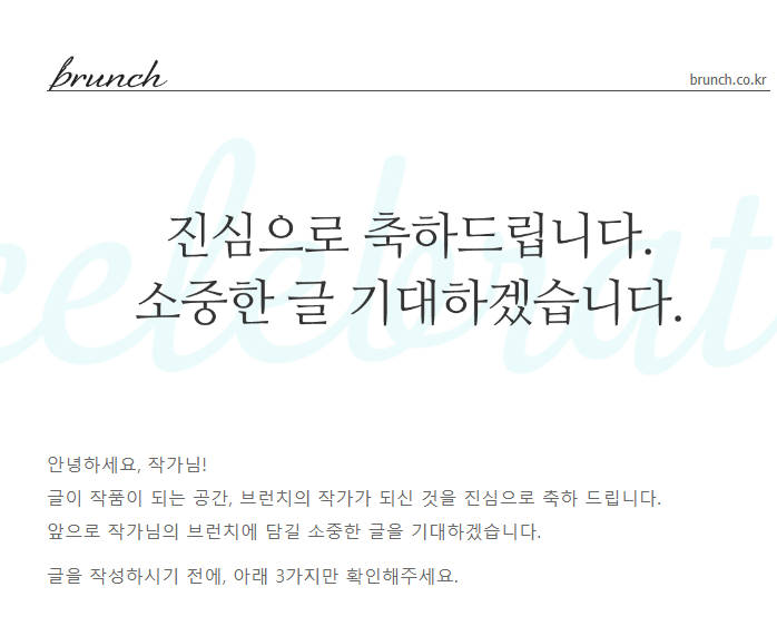 브런치는 평소 글쓰기에 관심을 가지고 있던 많은 분들의 꿈을 이루게 한 곳이다. 작가로서의 꿈을 가슴에 품고 살아온 분, 글쓰기에 소질이 있고 평소 많은 글을 써온 분들에게는 분화구와 같은 역할을 해 준 곳이다. 나 역시 특출한 능력은 없으나, 평소 기록하는 습관을 가지고 있었고 작가가 되겠다는 작은 열망을 품고 살던 사람이었다. 그러다 브런치를 알게 되고 세 번의 도전 끝에 브런치 작가가 되었다. 아마 처음 브런치 작가가 되었을 때의 기쁨을 잊지 않으신 분들이 많을 것이다. 합격 소식을 전해준 메일은 아직 보관함에 저장되어있다. 기뻤던 순간의 감격을 잊지 않고 늘 초심으로 글을 쓰고자 노력하는 잣대로.