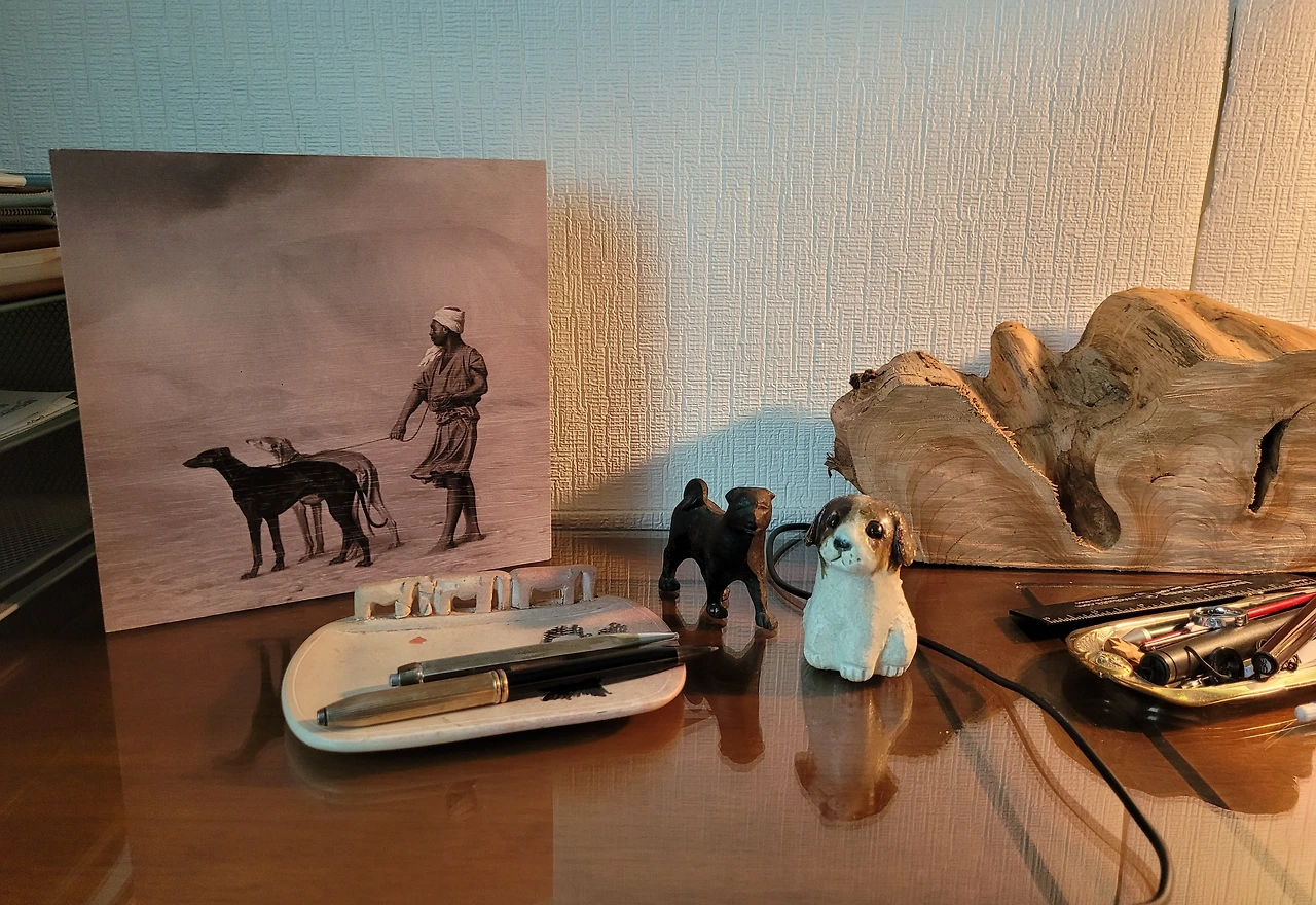 그 밖에도 여행 시에 구입한 작은 기념품 몇 가지를 둔다. 나의 수집품? 은 그곳이 아니면 살 수 없는 추억이 담겨있는 물건이다. 벼룩시장을 즐기기에 올드한 소품이며 명품은 더욱 아니다. 좋아하는 개에 관한 것이나 문구류다. 오늘 서재를 꾸미다가 잊힐뻔한 멋진 작품을 발견하게 되고 책상 위에 두고 보게 되니 잘 어울리고 좋다. 이것도 시도했으니 얻게 된 것이다.