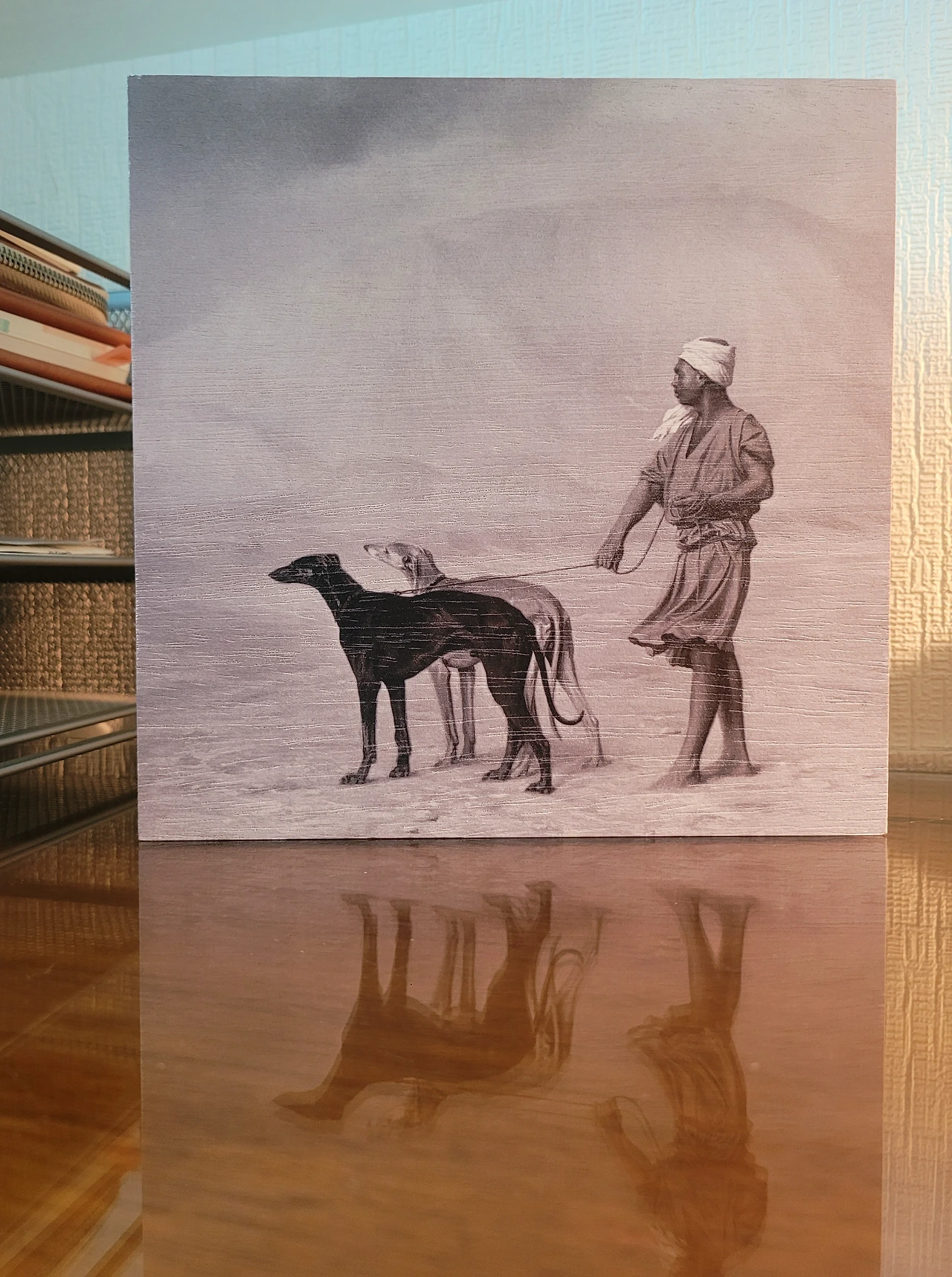 액자 뒷면에 있는 작가이름 Goupil을 찾아보니 프랑스 출판인으로 1866~1867 "사막에서"라는 제목으로 두 마리의 개(휘핏?)를 데리고 가는 누비아인을 찍은 사진이라고 나온다. 내가 산 액자는 이 사진을 목재에 프라도 미술관에서 판매용으로 프린팅 한 것이었다. 개와 함께 있는 분위기가 좋아 구입하면서 당연히 그림이라 생각했는데, 사진이었나 보다.