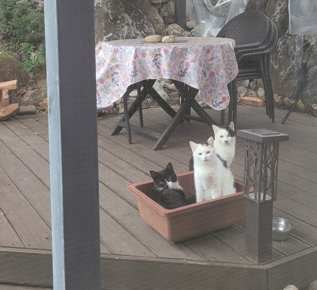 햇살이 좋은 날엔 온 마당이 저희들 놀이터다. 노란 잔디를 온몸에 묻히고 강아지들이 짓어도 정원과 돌틈 사이로 헤집고 다닌다. 낮은 장미가시에 찔리지나 않을지 걱정될 정도다. 제 집 옆에 있는 라일락나무는 발톱훈련용으로 긁었는지 상처투성이다. '나가서 놀아'라고 야단을 쳐도 꿈쩍 않다가 한 번씩 나가면 하룻밤도 안 들어올 때가 있다. 그래도 새끼들을 데리고 다닌다. 밥을 먹은 후엔 다섯 마리가 같이 논다. 어쩌면 올봄에 다 성장해 각자 따로 다닐진 몰라도 가족이란 걸 아는 듯 늘 함께 하는 편이다. 삼냥이들은 배를 채운 후 데크에서 논다. 길냥이던 사랑을 받고 있는 집냥이던 간에 고양이의 본능은 순간순간을 즐기는 것이다. 어떠한 경우에도 상황에 구애받지 않고 즐겁게 지내고 있다. 솔방울을 굴려가며 아주 귀엽게 논다. 강아지들이 안에서 난리를 치는데도, 이 아이들은 얻어먹는 신세인지 또 나가야 될 신세일지도 모르지만 아무것에도 구애받지 않고 자기들의 본능에 충실하다.