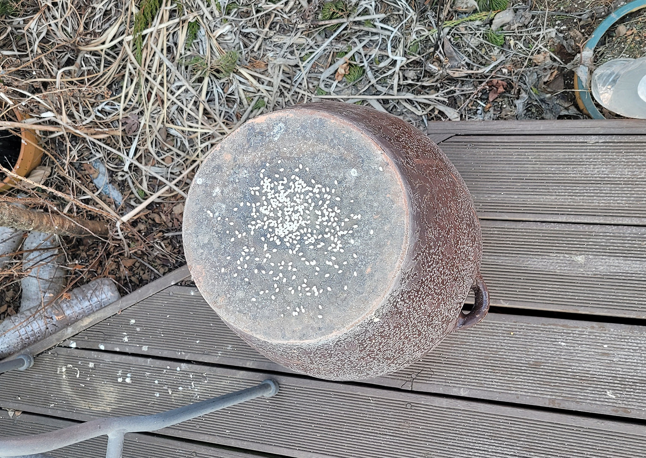 오래된 항아리 밥그릇 위에 묶은 곡식 두어줌 올려 줍니다.