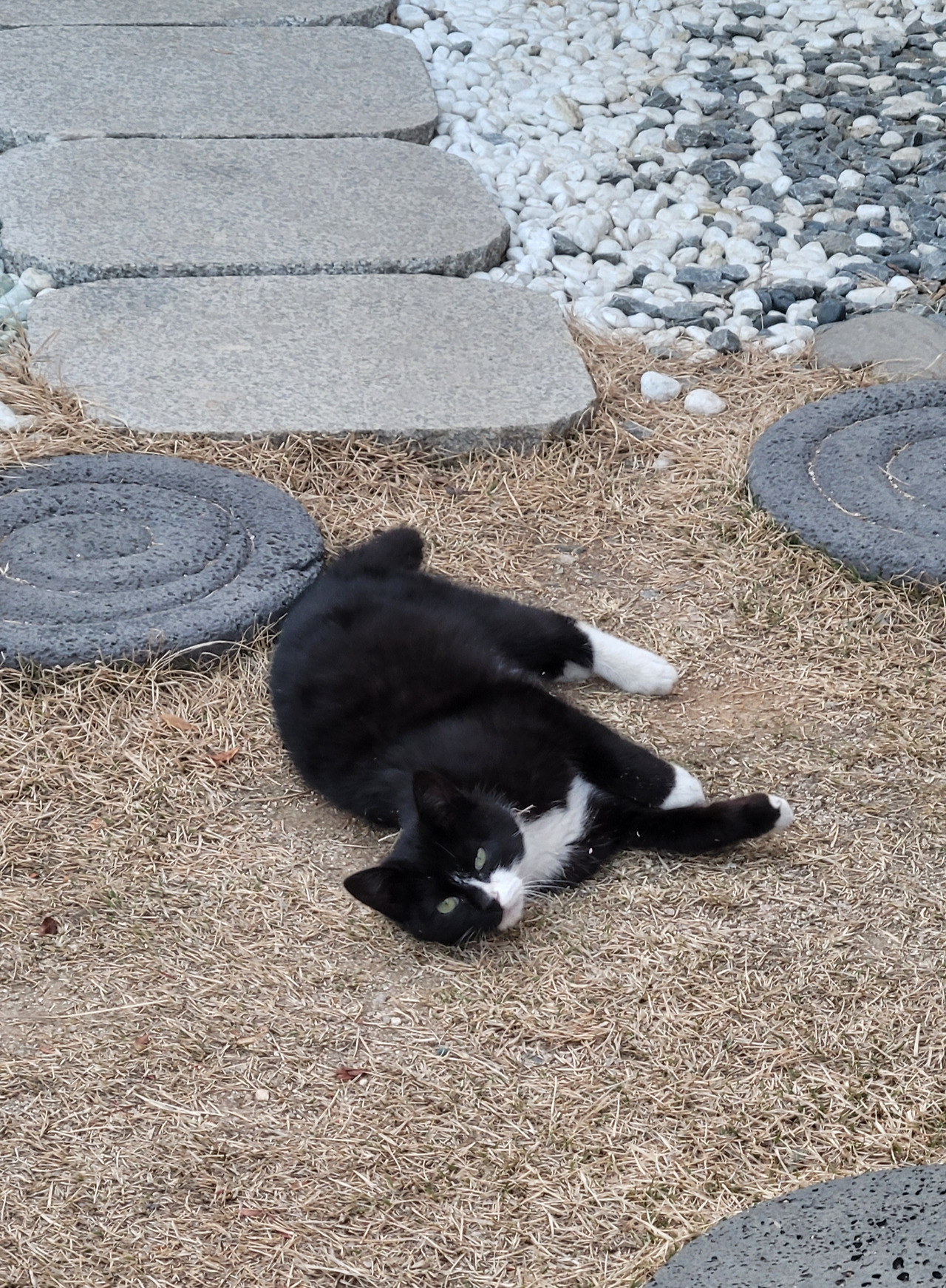 부지런히 마당정리를 하고 있는데, 삼냥이 중 가장 애교가 많은 깜냥이가 잔디에 등을 비비면 배를 내보이고 애교를 떱니다. 나무나 꽃처럼 마당의 친구라 어울리는 풍경입니다. 올해는 마당도 헤집고 다닐 것 같은데, 혹여라도 장미가시에 찔릴까 봐 염려도 됩니다.