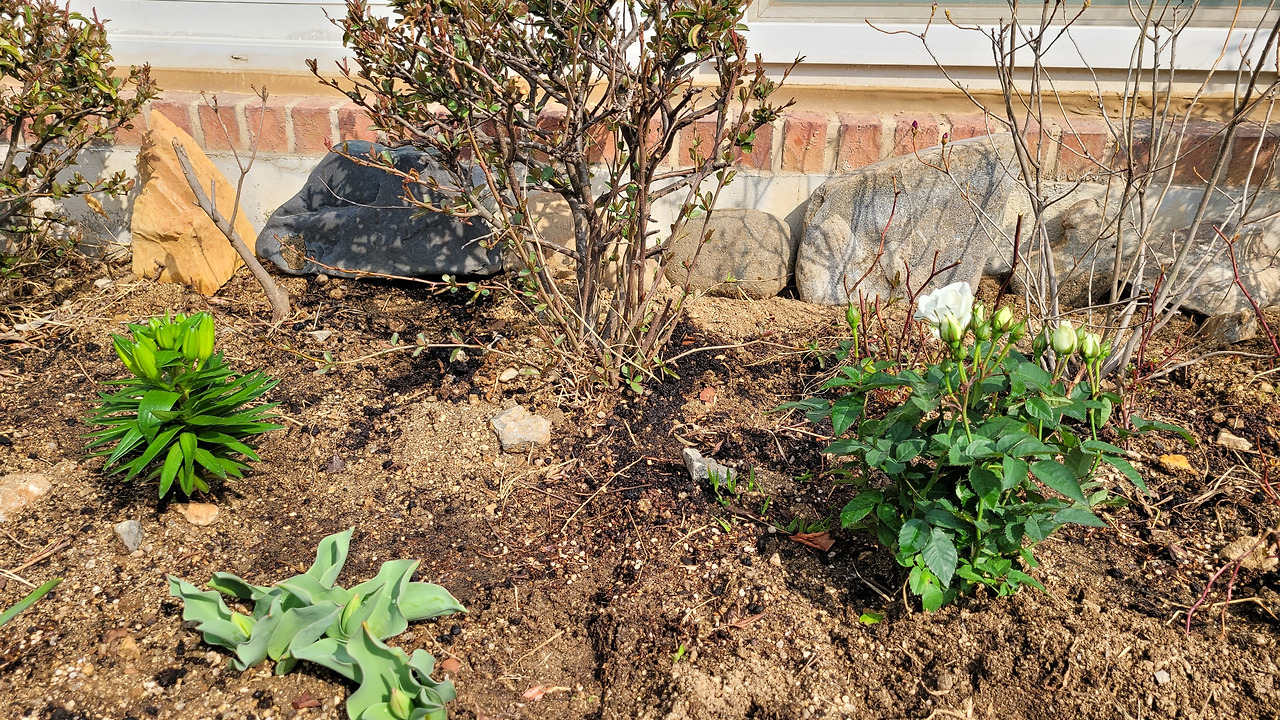 늦게 돌아와 앞마당에 미니 장미와 나리를 심은 후 다른 장소를 찾아 겹 백합을 하나씩 따로 심었다. 백합은 이파리도 많고 키도 아주 크기 때문에 심을 때 앞쪽보단 뒷 쪽이 좋다. 그러면서도 햇빛이 잘 드는 곳이 좋다.