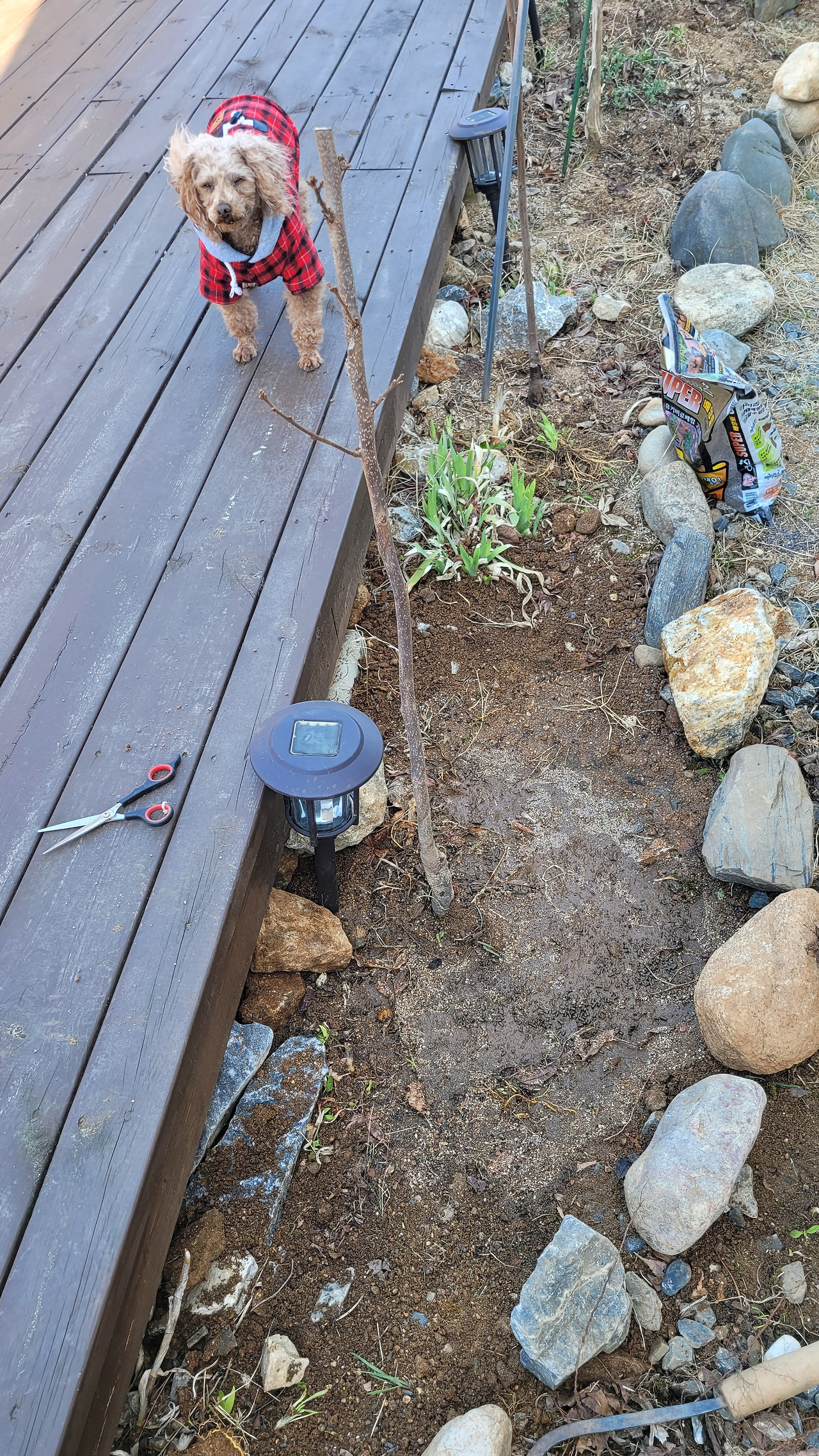 구덩이에 분갈이 흙도 넣고 자리 잡아 잘 심어 줬다. 흙을 다진 후 지줏대까지 닦아주고 마무리한다.