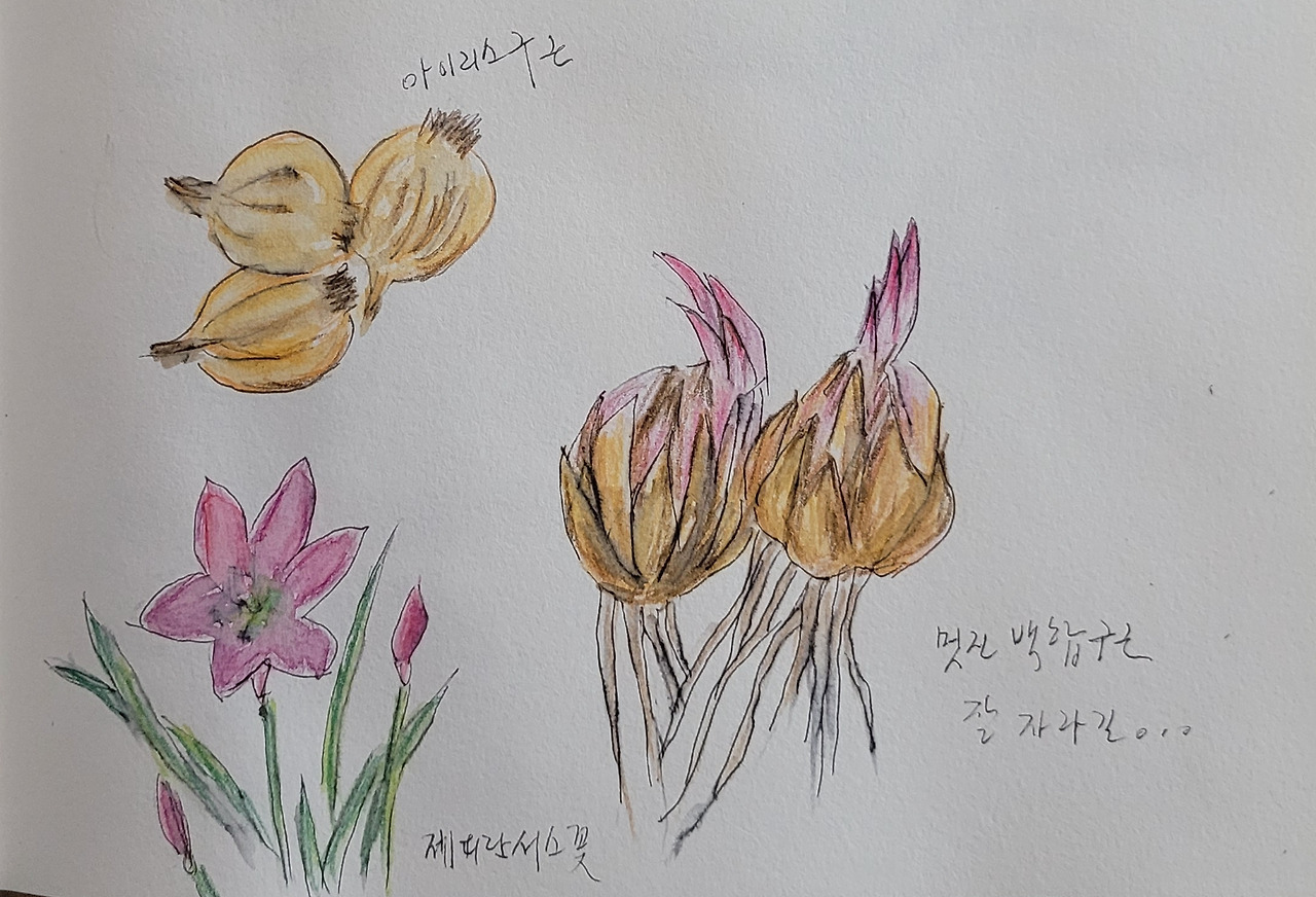 그림일기는 하네뮬레 A4 스케치북에 라미만년필로 쓰고, 그림을 스케치한 후 파버카스텔 수성색연필로 색을 입혔습니다. 스케치일기 전체를 스마트폰(갤럭시노트 20)으로 찍어 보니 글씨 읽기가 좋지 않아, 그림만 잘라 올리고 글은 그대로 컴퓨터로 옮겼기에 글로써도 부족한 면도 있을 것입니다.