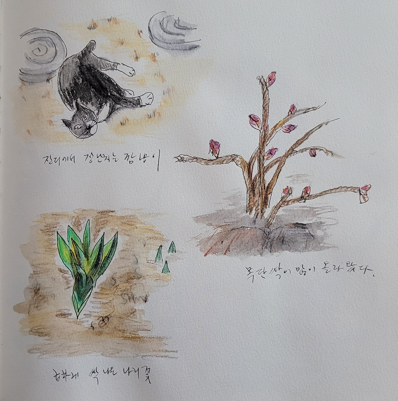 마당쪽 베란다 데크 청소를 했다. 겨우내 (물론 지금도 그렇긴 하지만...) 길냥이들의 놀이터가 되었던지라 냄새가 많이 베인듯 했다. 호스를 길게 풀어 물을 뿌려 깨끗히 닦아 냈다. 햇살에 잘 마를 것을 생각하며 열심히 청소했다.